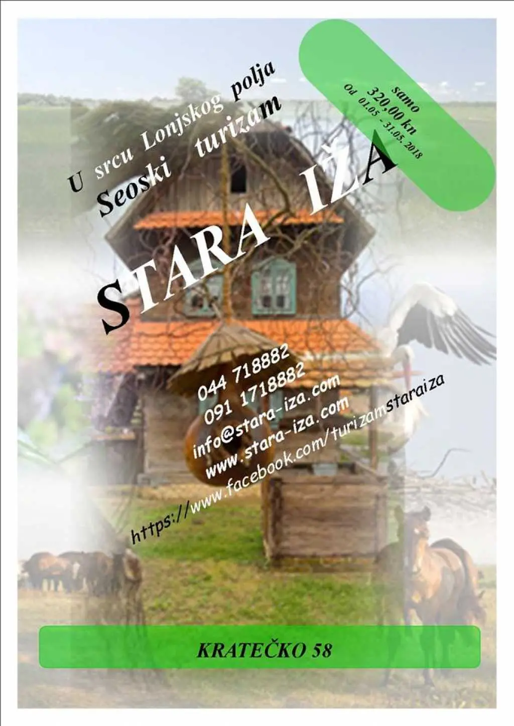 Rural tourism "Stara Iža" is located in the center of the Lonjsko polje Nature Park in Kratečko village about 30 km. from Sisak. The apartment is equipped with an LCD TV, air conditioning and Wi-Fi access. As part of the "Stara Iža" rural tourism, guests can also use the services of restaurants where we serve traditional food, and especially the specialty of "Carp on rails", Moslavina wines and plum specialties. As an integral part of the rural tourism there is also a gift of the gallery "Roda -art". Stara Iža offers accommodation in an old (200 g) traditional family house decorated with original furnishings. The apartment is adapted to modern living and consists of a room equipped with a kitchenette and a toilet with a shower. Guests can use the yard terrace, family yard and garden grill Guests can use the yard terrace, the family yard, the parking and the garden grill. Sojourn tax 5.50 kn per guest and day (except children) is charged at the property.