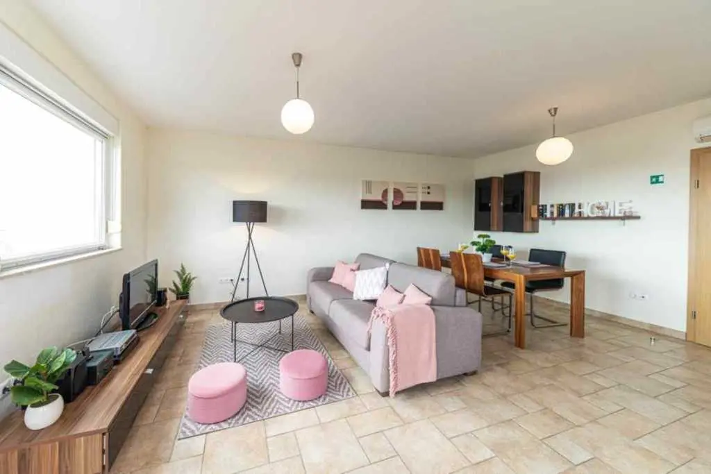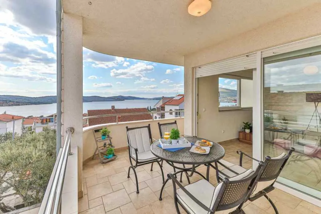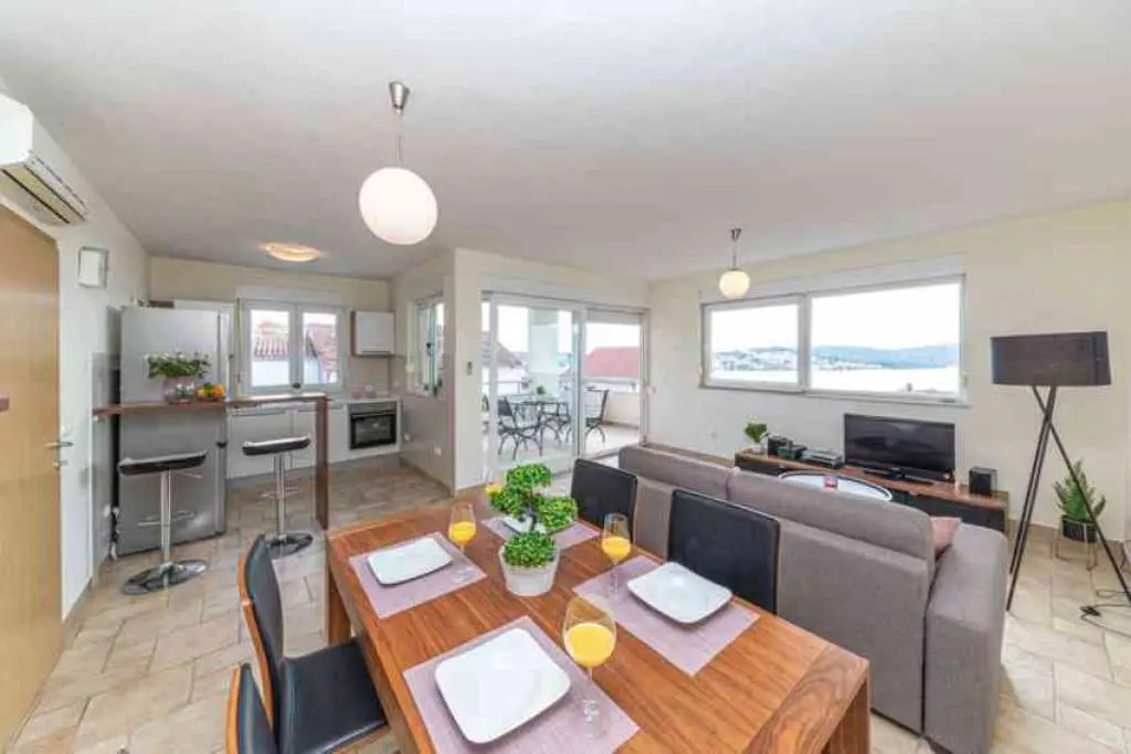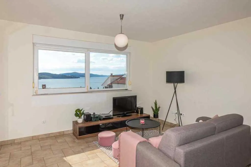 The beautiful studio apartment Gloria is located on the ground floor newly built house on a hill ( Villa Trigon) only some 200 m from the main 2 km long beach in Okrug Gornji. Air-conditioning studio apartment GLORIA is completely renovated in 2012 in vivid colors and it's composed of: Living room/Bedroom with large double bed, sofa, a flat screen satellite TV+DVD player internet, table and chairs, iron, vacuum cleaner, safe, Kitchen: fully equipped with electric stove, microwave, fridge, freezer, cupboards and utensils, Bathroom with shower, sink, wc, hair dryer and washing machine. Apartment has a specious terrace overlooking the beach and the sea. It's ideal for 2 persons. Free private parking is in front of the house.