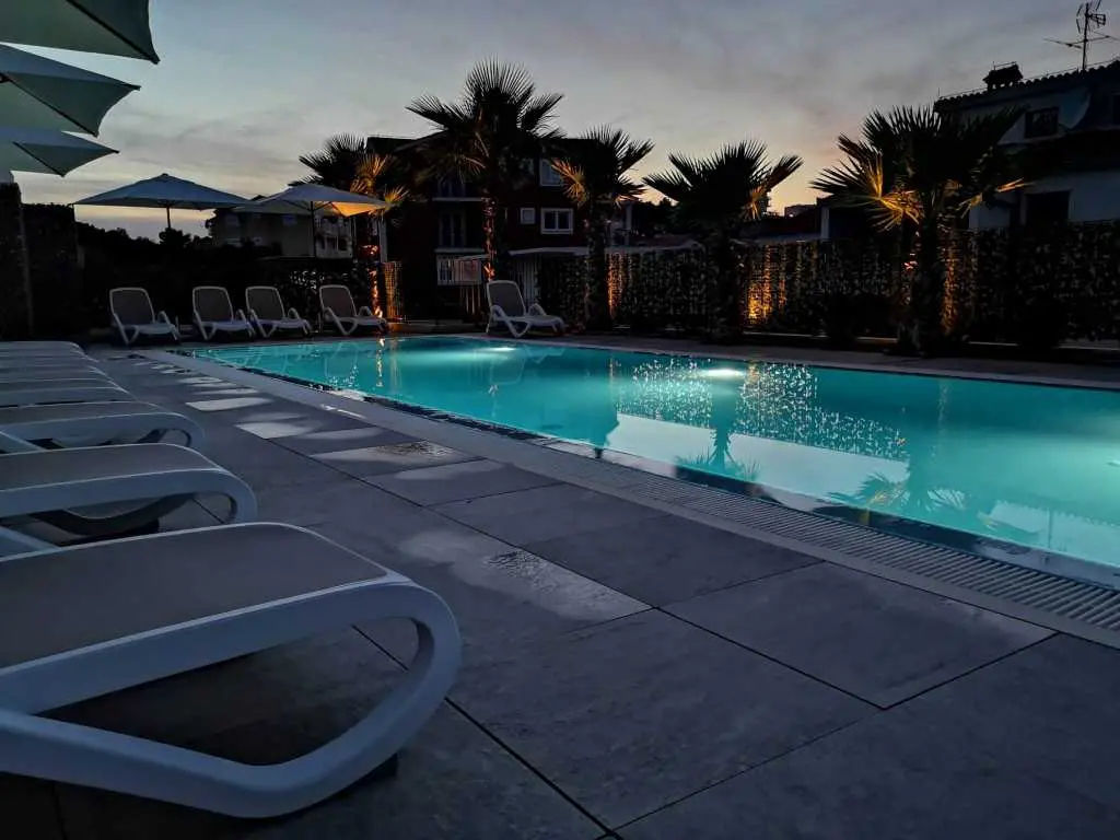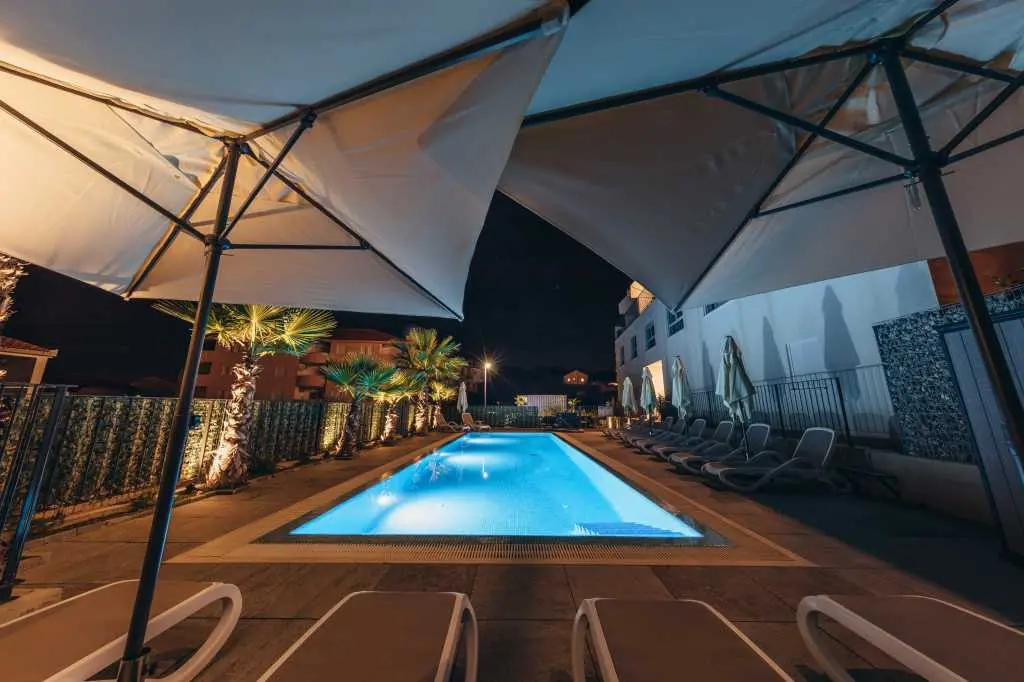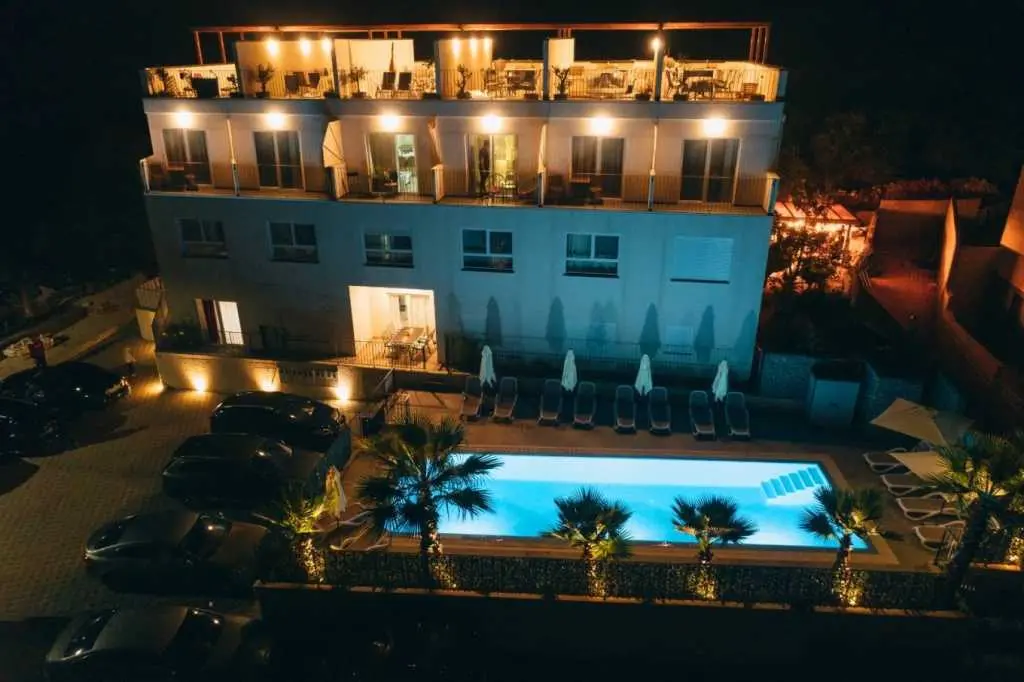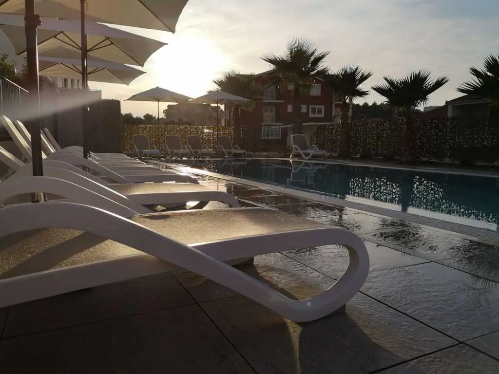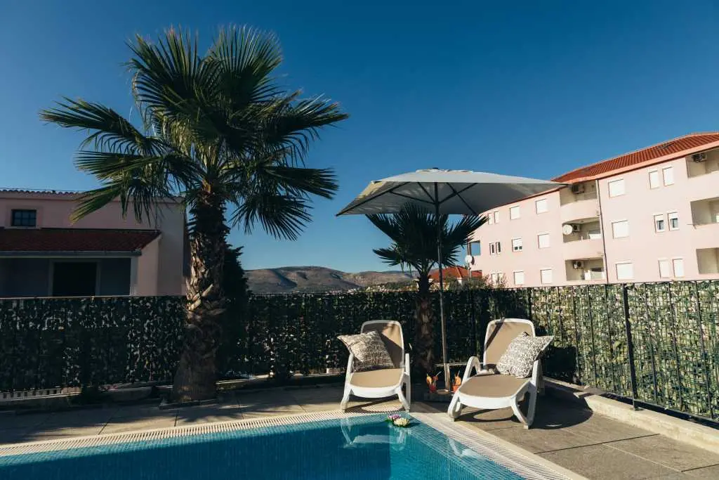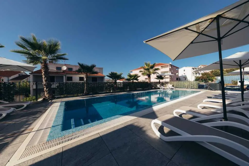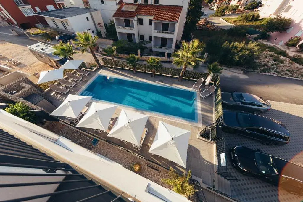 The new two-bedroom apartments are located in a quiet part of Okrug Gornji, only 5 minutes walk to the beach in Okruška uvala, and 10 minutes walk to the beach Tatinje. The apartments are modernly furnished, fully equipped kitchen, roof terrace 25 m2 with beautiful sea views, satellite TV, free wifi. In front of the building there is a pool of 48 m2, the water in the pool is heated. On the roof terrace there is an electric grill, small refrigerator, sink with hot and cold water. Both bedrooms and living room have AC. Each apartment also has a free parking space. Distance to the pebble beach, restaurants, beach bar is about 230 m, distance to the beach Copacabana is about 600 m. To the supermarket about 130 m. Staying in our apartments you will enjoy your vacation. It is located in a very attractive location, only 10 km away from Split airport. Numerous attractive excursions are available, such as day trips by boat (to visit other islands) or by car (Krka or Plitvice waterfalls). From the nearest beach there is a boat ride to Trogir. There is a long pebble beach with many bars and restaurants, but also many small hidden beaches for guests who love privacy.