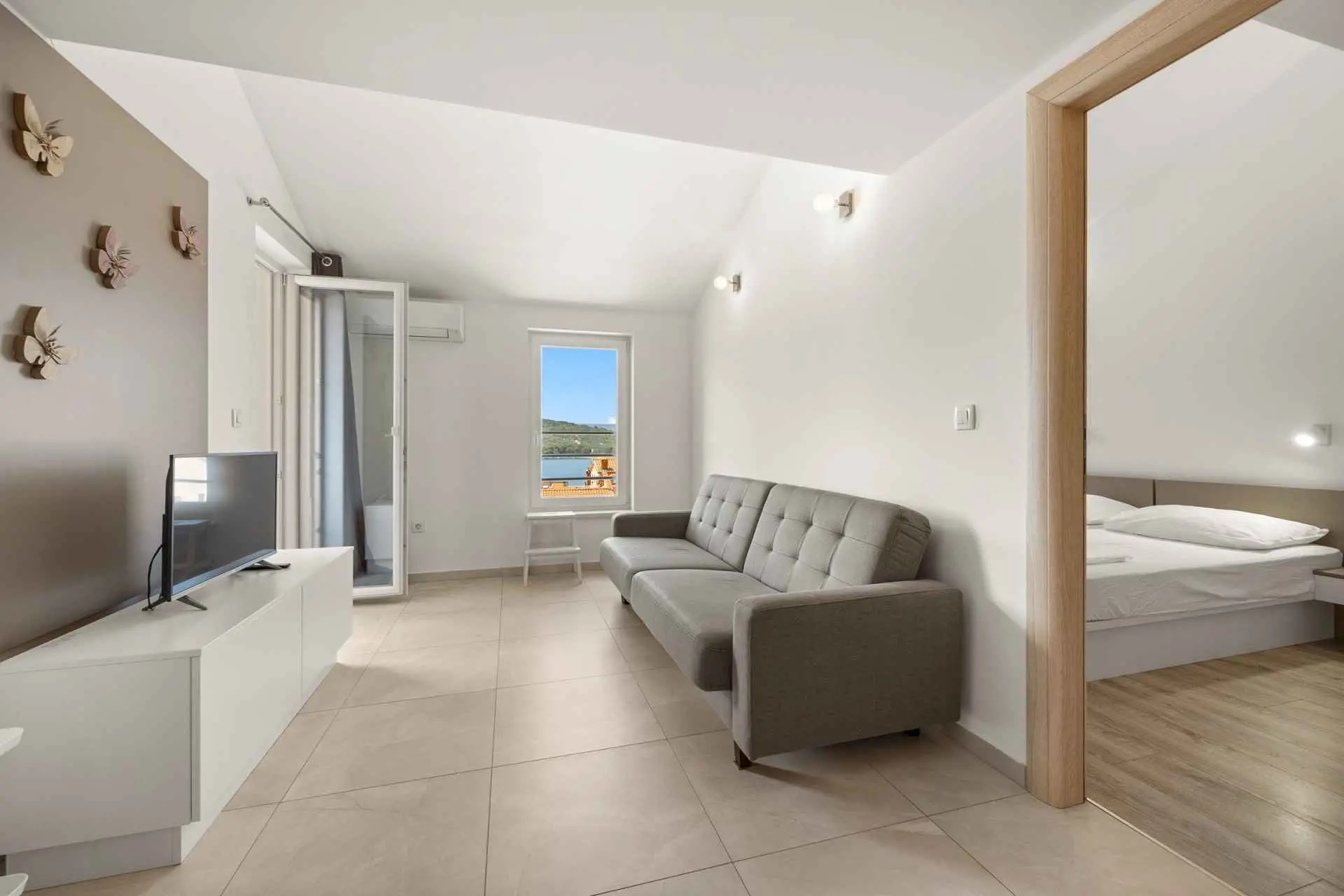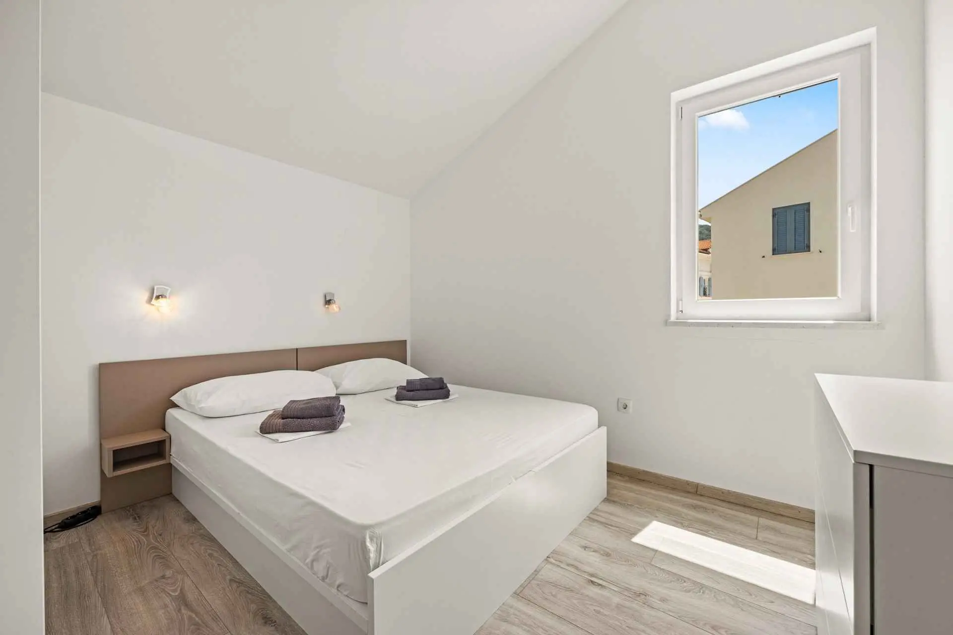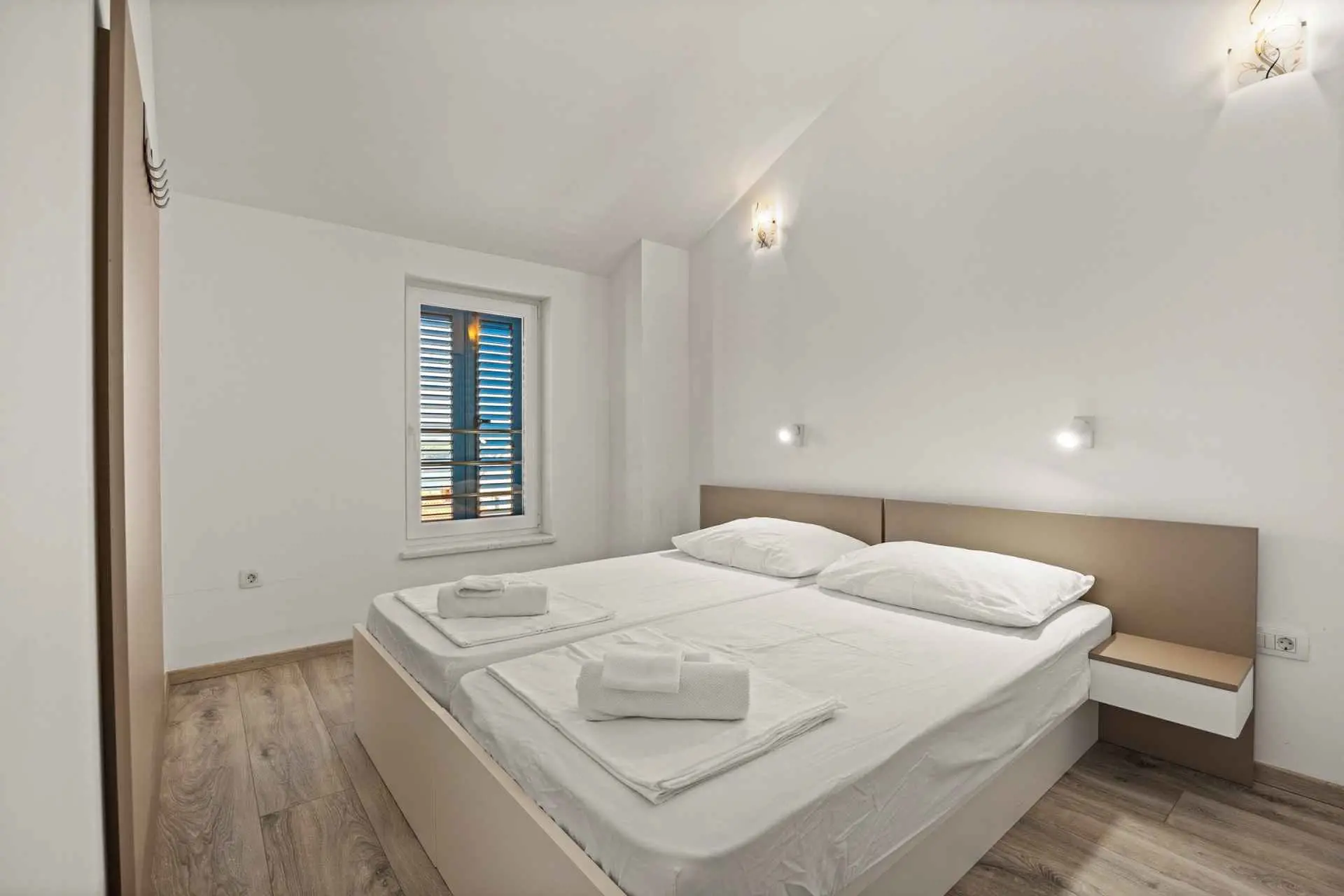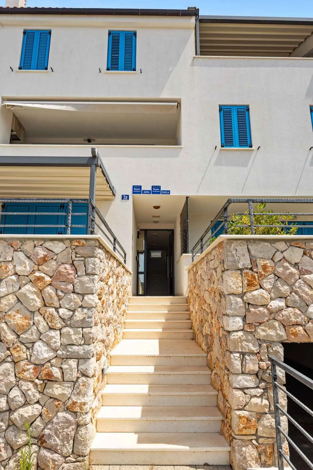 Beautiful Apartments Jana & Paula are located in Cres, just 700 meters from the city Center, yet outside of the city bustle.Both apartments have maginificent sea view from the balcony. Apartment Jana consists of two bedrooms, a living room, a kitchen, two bathrooms and a balcony with beautiful sea view. One bedroom and bathroom are located on the gallery, which makes it a perfect choice for a children's corner. Additional two airbeds can be placed in the gallery, turning the apartment into a perfect space for up to 4 adults and 2 children. One parking space is provided in front of the building, and another one can be provided the garage. If you need two parking spaces, please notify us in advance. Apartment Paula consists of two bedrooms, a living room, a kitchen, one bathroom and a balcony with beautiful sea view. One parking space is provided in front of the building.