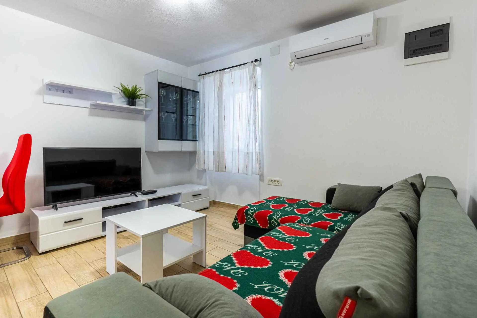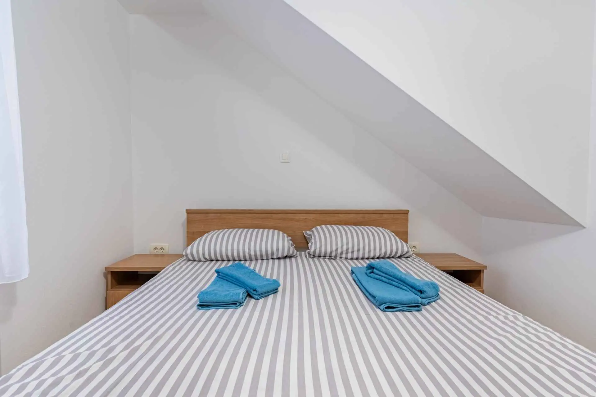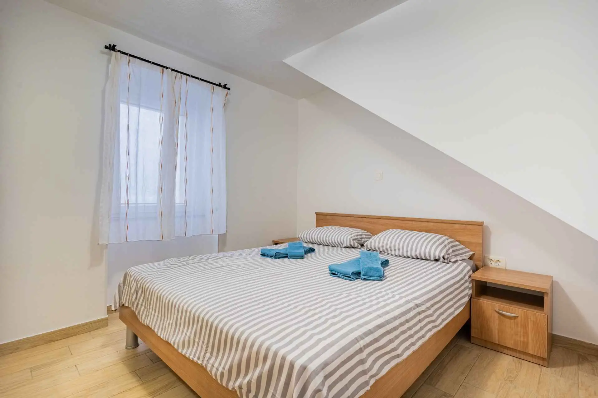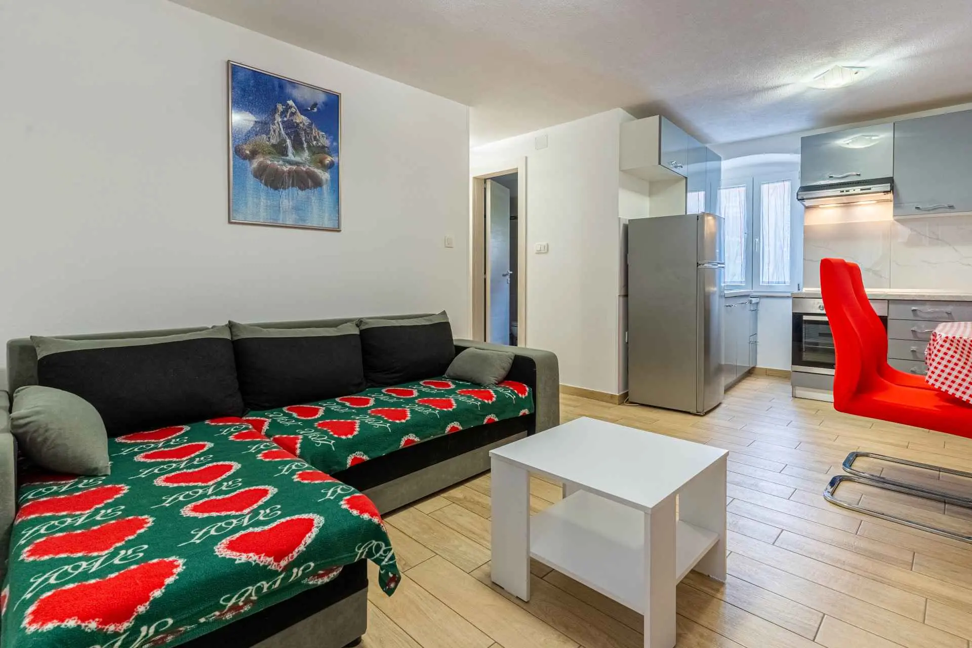 The apartment is located on the ground floor of the family house and has its own separate entrance. It is located in a quiet part of the old town, where all necessary facilities (restaurants, bakery, orchard, butcher, coffee bar, pharmacy, etc.) are only a 2-minute walk away. The apartment is modernly equipped, and includes one bedroom with a large bed, a kitchen with a refrigerator and an oven, a bathroom with a large shower and a washing machine, a living room with air conditioning and a TV. The price includes free Wi-Fi and a private parking space near the apartment.