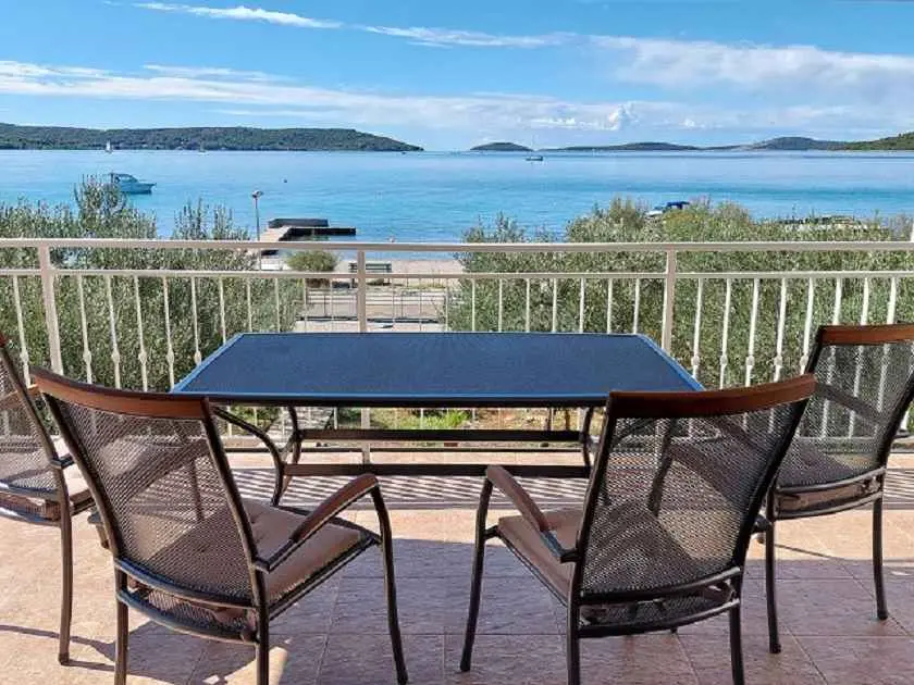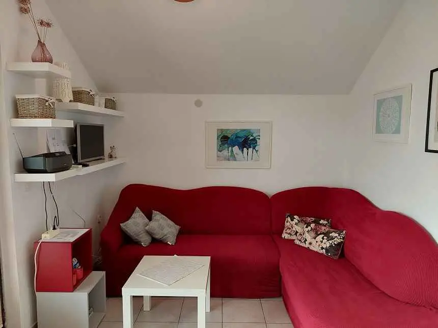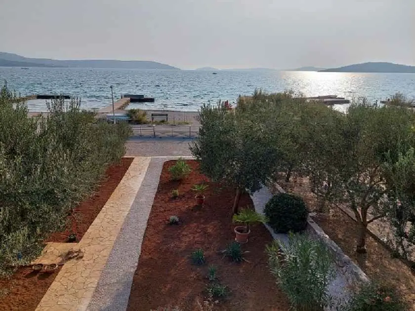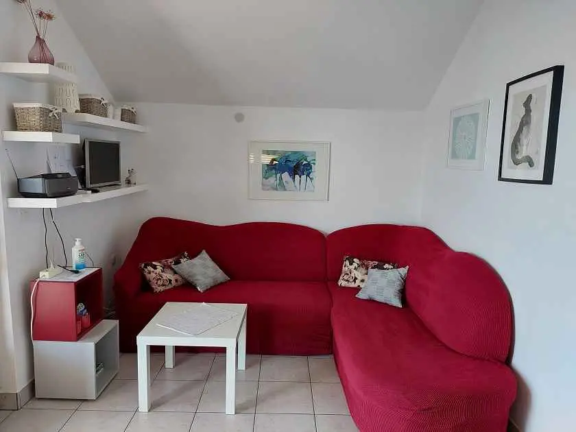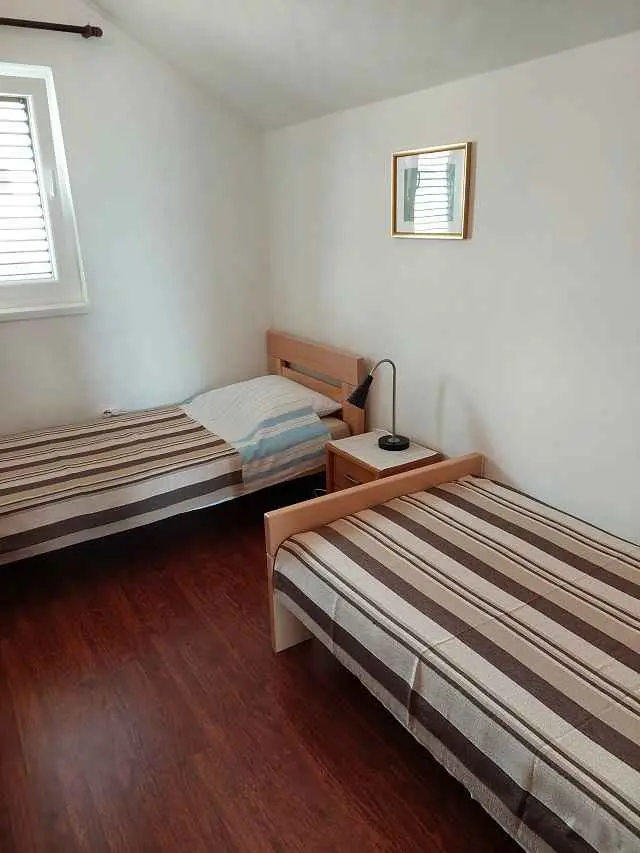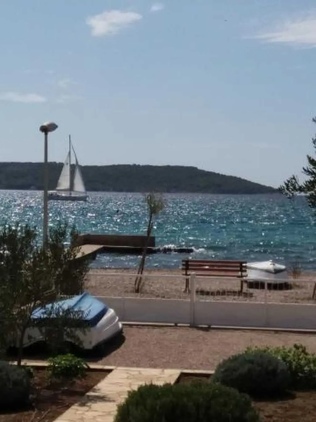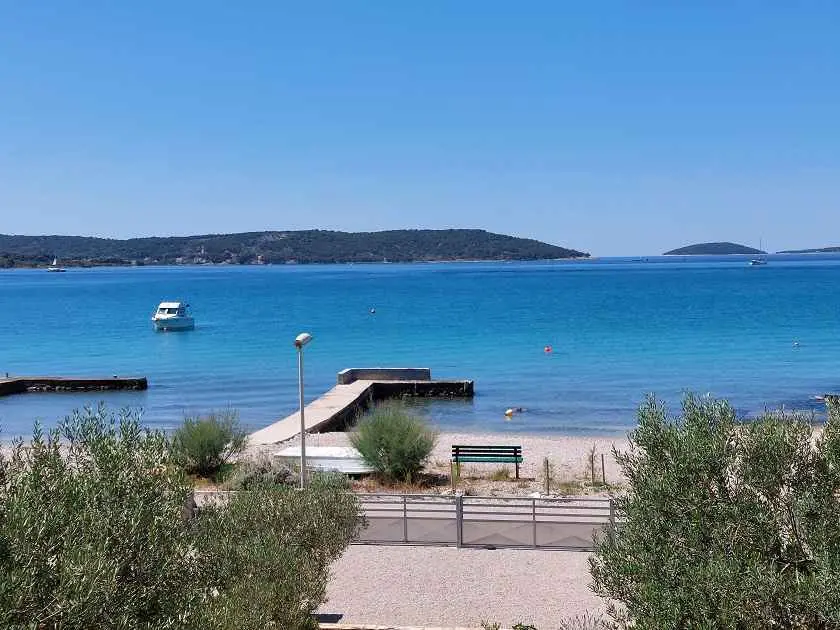 Apartment for rent in Jadrija, a place located near Vodice and Sibenik, an ideal destination for families with children. Jadrija is near two national parks (Krka and Kornati) and is an excellent base for excursions. The apartment is located on the first floor, in the first row to the sea, only 30 meters from the beach. The apartment has a kitchen, living room, 5 beds (4+1) and a bathroom with shower. It has a separate entrance and a large terrace overlooking the islands of Sibenik. The apartment is fully equipped. In the center there are sports courts, swings for children, a restaurant and pizzeria. The apartment is rented from June to September, and to confirm the reservation it is required to pay 20% in advance. The remaining amount is paid upon arrival. In case of cancellation of the reservation or non-arrival, the paid amount of the reservation will not be returned. For staying less than 3 nights, the price is increased by 20%. Check in 14 h, check out 10 h.