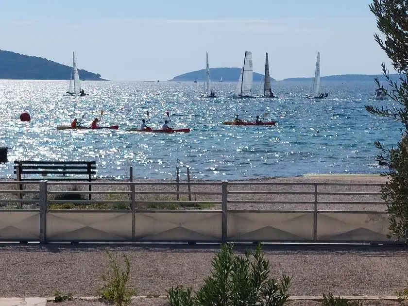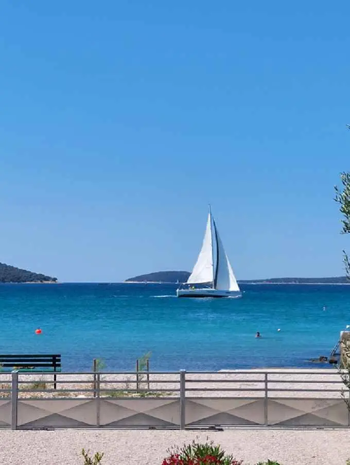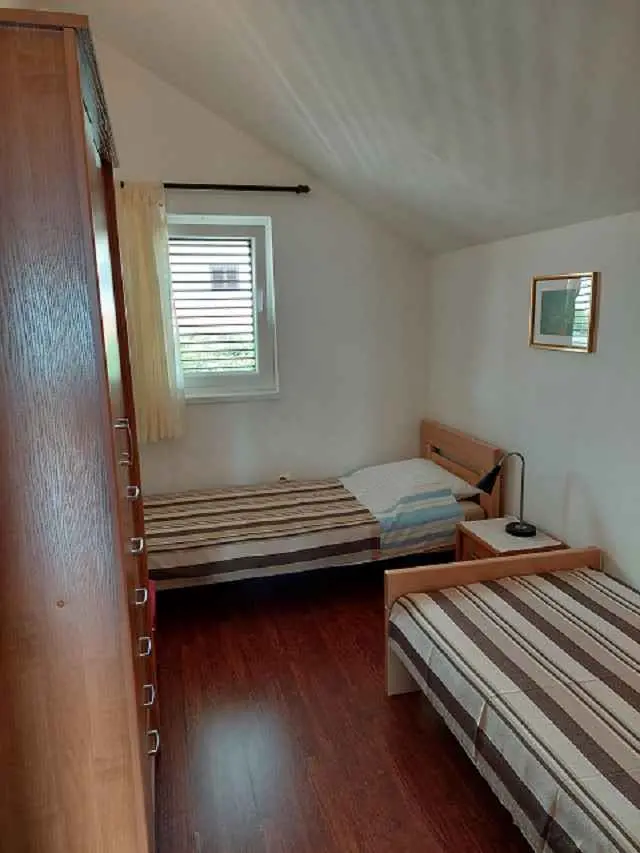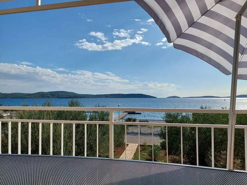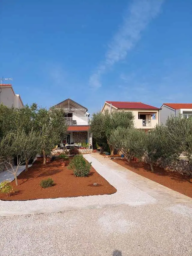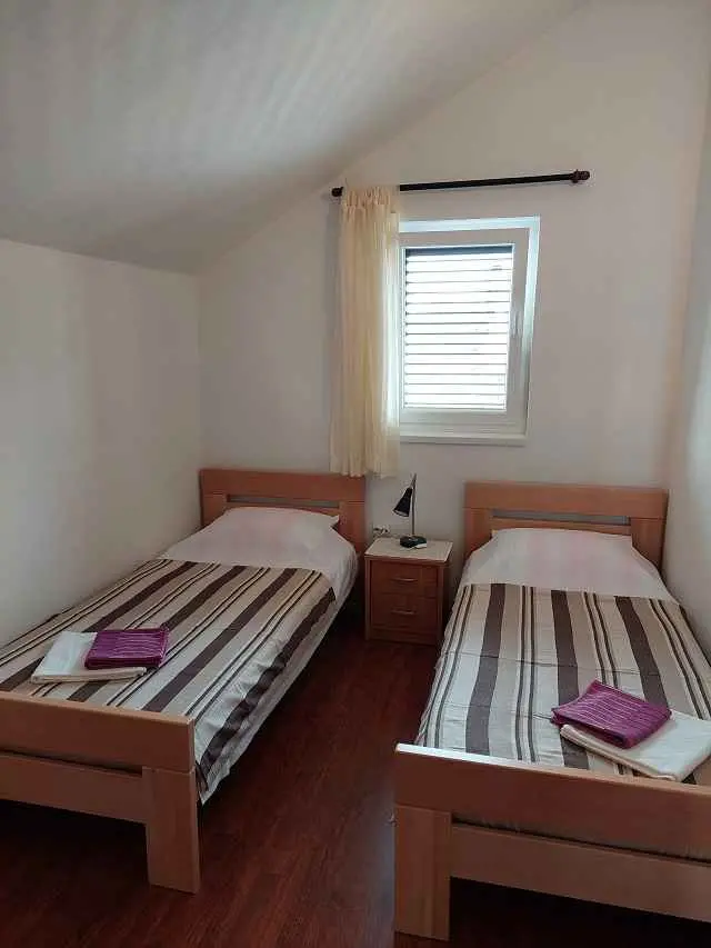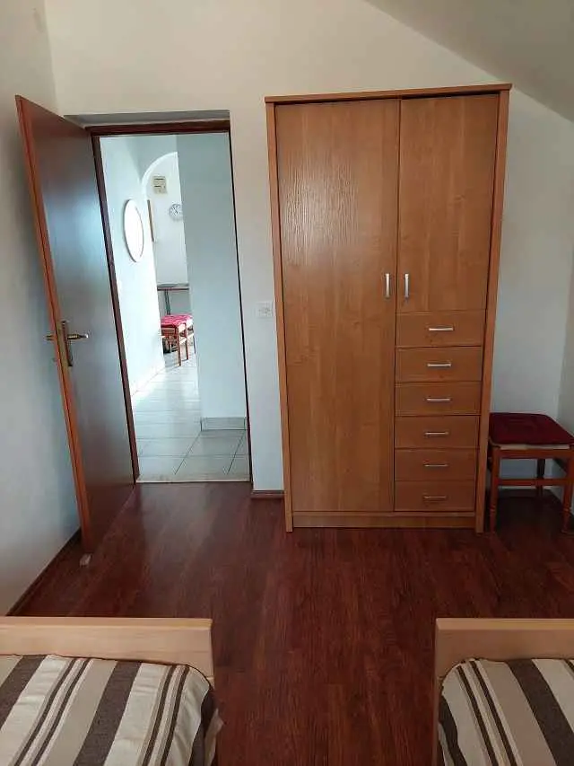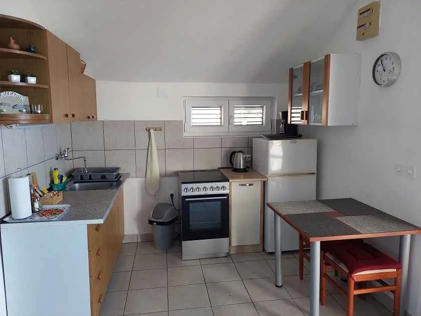 Apartment for rent in Jadrija, a place located near Vodice and Sibenik, an ideal destination for families with children. Jadrija is near two national parks (Krka and Kornati) and is an excellent base for excursions. The apartment is located on the first floor, in the first row to the sea, only 30 meters from the beach. The apartment has a kitchen, living room, 5 beds (4+1) and a bathroom with shower. It has a separate entrance and a large terrace overlooking the islands of Sibenik. The apartment is fully equipped. In the center there are sports courts, swings for children, a restaurant and pizzeria. The apartment is rented from June to September, and to confirm the reservation it is required to pay 20% in advance. The remaining amount is paid upon arrival. In case of cancellation of the reservation or non-arrival, the paid amount of the reservation will not be returned. For staying less than 3 nights, the price is increased by 20%. Check in 14 h, check out 10 h.