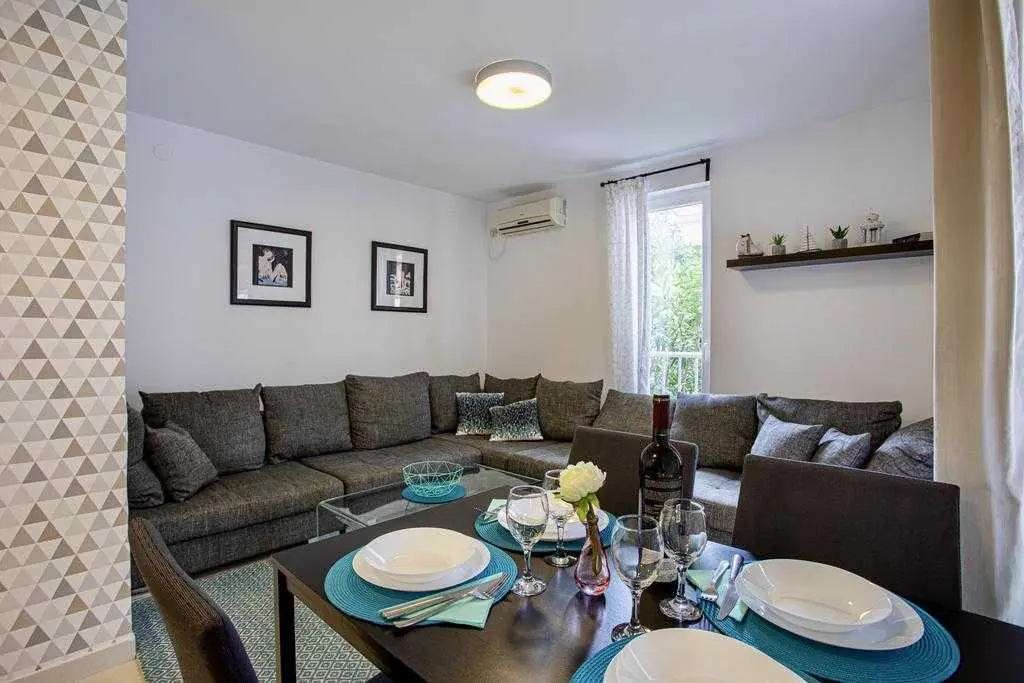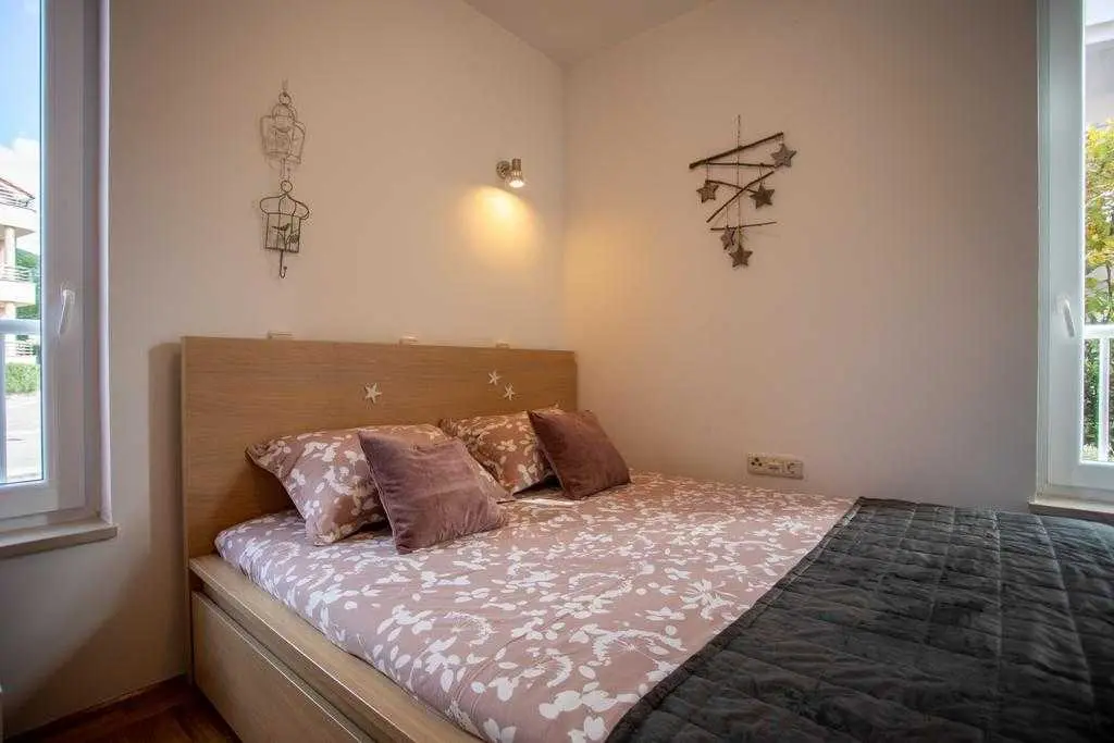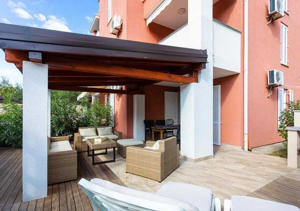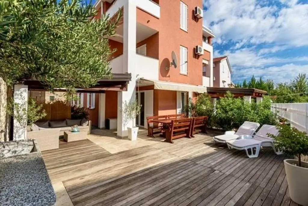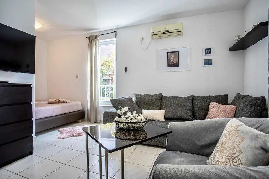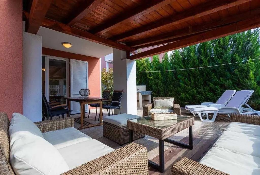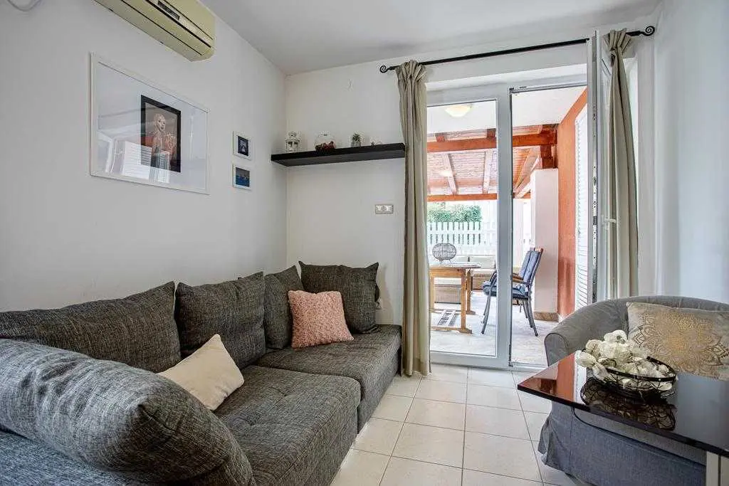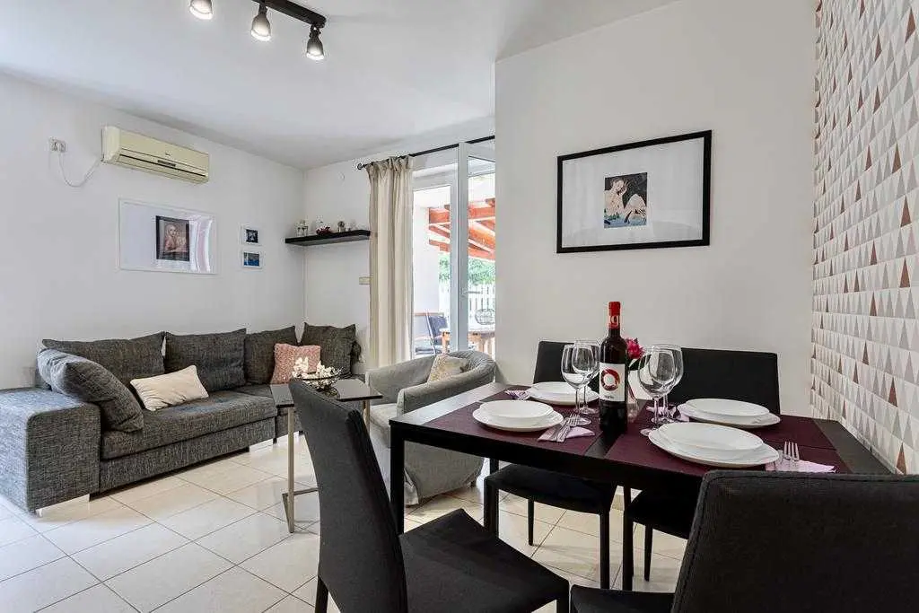 Very modern designed apartments on the ground floor with a big terrace, electric grill and garden. The apartment is placed in a quiet street only400 m from the main beach and street with restaurants and bars. It has a living room with a big seating area and dinning place, kitchen, bath room with cabin shower, 1 bed room with a master bed size 160x200. The second master bed size 160x200 is placed in the living room. Kitchen is equipped with electric owen, stovetop, refrigerator, coffe machine, toster and other needed dishes. There is a . WI-FI, SAT flat- scren TV,air-condition, 1 park space in front of the apartment all inclusive. Ideal summer accomodation!