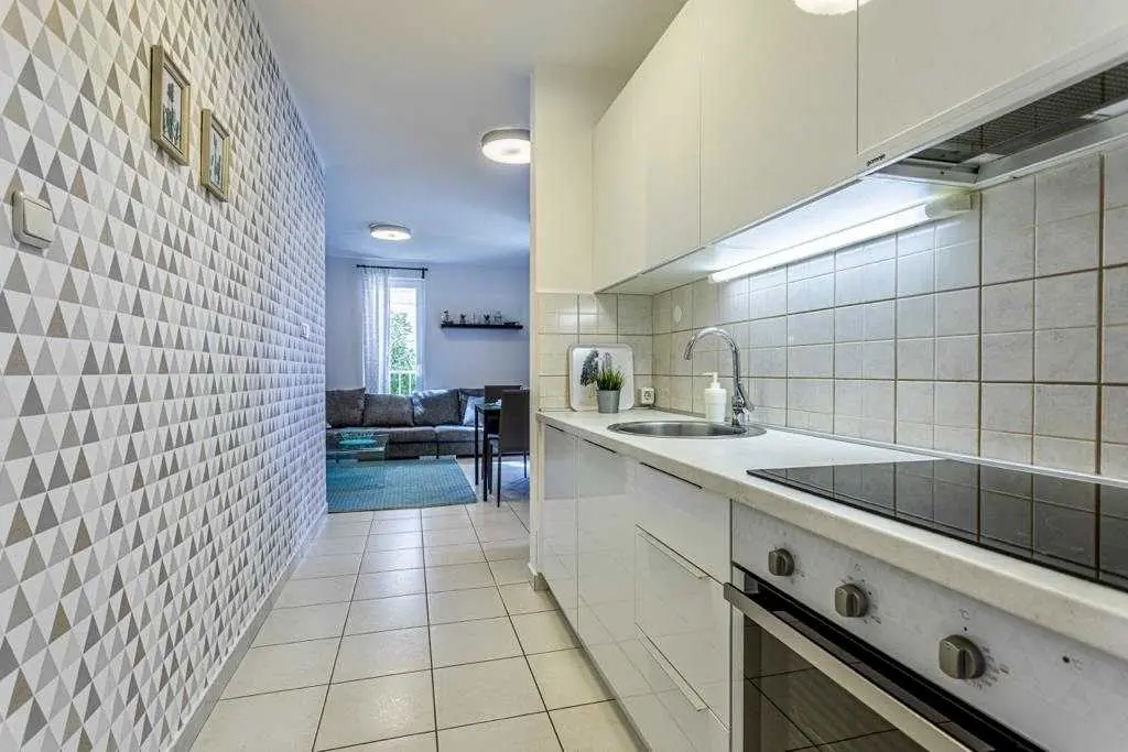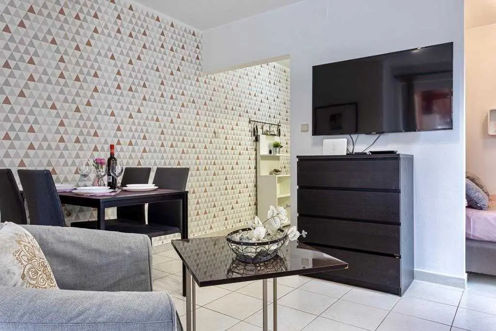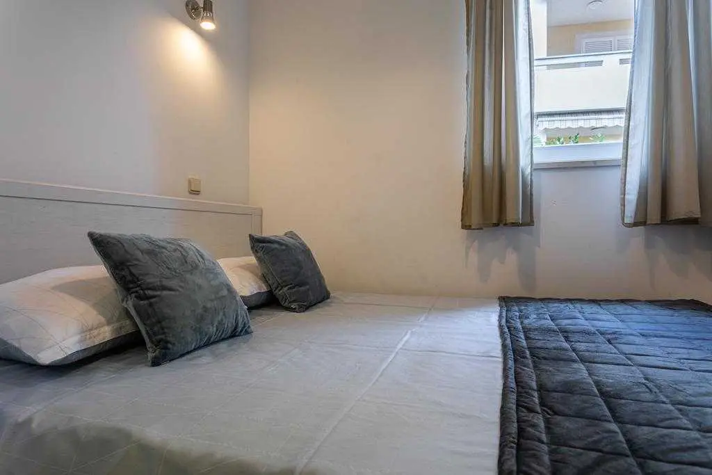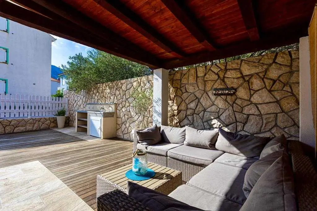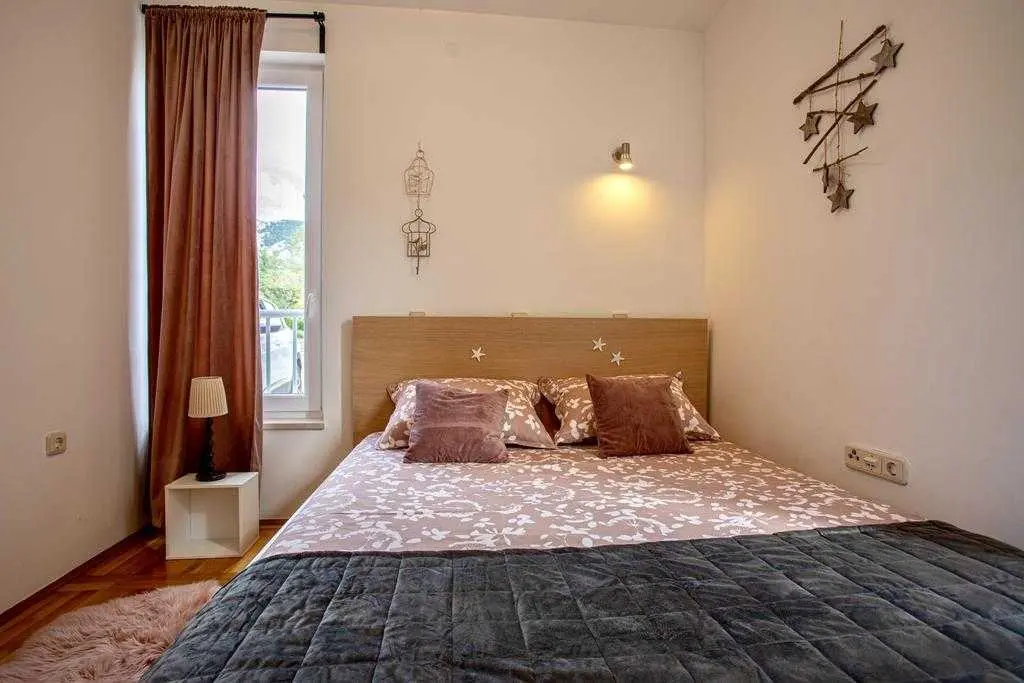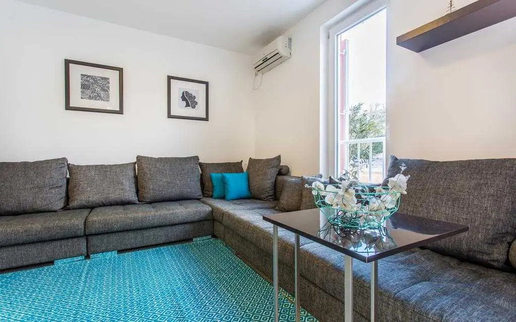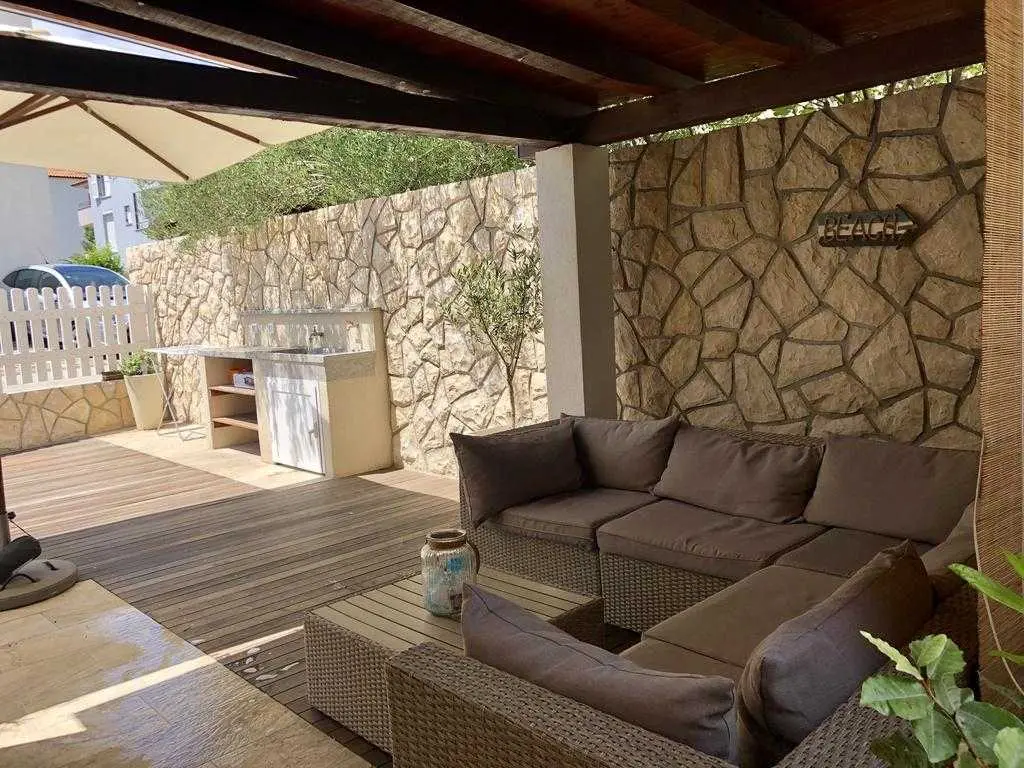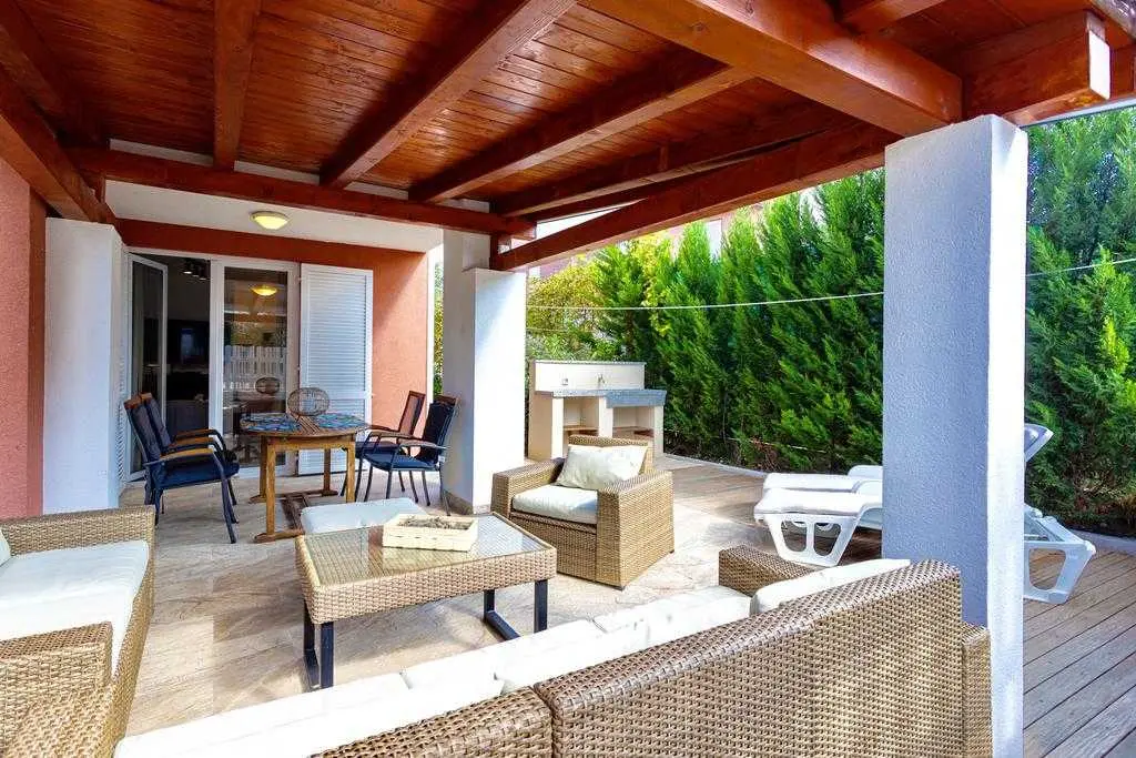 Very modern designed apartments on the ground floor with a big terrace, electric grill and garden. The apartment is placed in a quiet street only400 m from the main beach and street with restaurants and bars. It has a living room with a big seating area and dinning place, kitchen, bath room with cabin shower, 1 bed room with a master bed size 160x200. The second master bed size 160x200 is placed in the living room. Kitchen is equipped with electric owen, stovetop, refrigerator, coffe machine, toster and other needed dishes. There is a . WI-FI, SAT flat- scren TV,air-condition, 1 park space in front of the apartment all inclusive. Ideal summer accomodation!