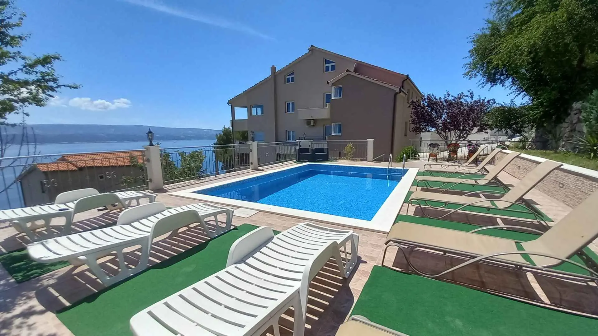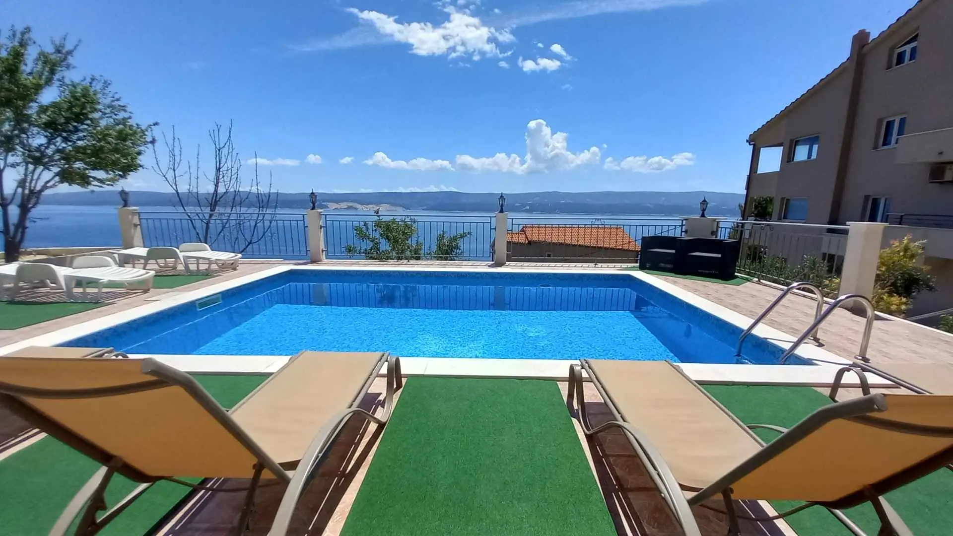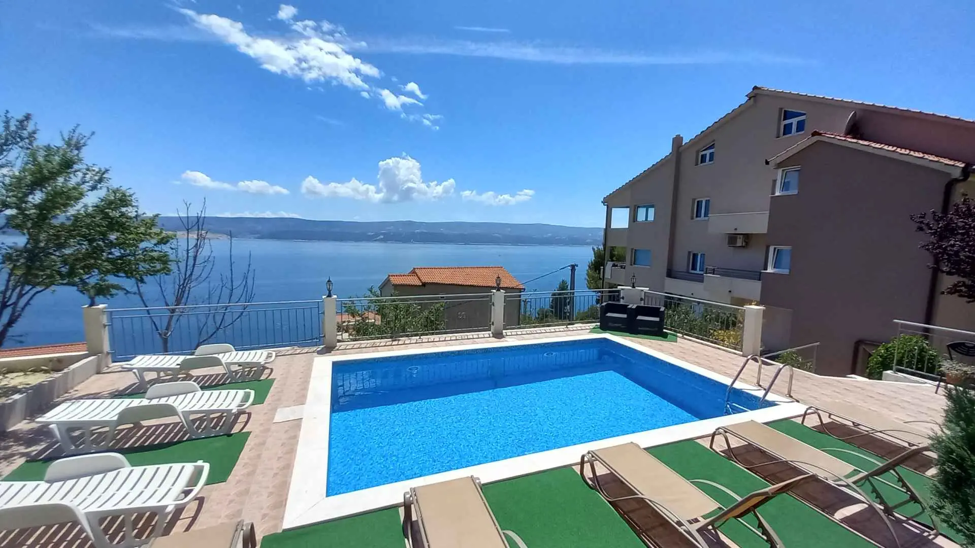 Modern apartments with a swimming pool in the small tourist town of Čelina, 5 kilometers from the capital Omiš. We offer two two-room luxury apartments. Apartment description: Apartment A 5 +1 is located on the first floor and consists of two bedrooms, fully equipped kitchen, living room, bathroom and toilet. It has a large terrace facing south with a stunning sea view and two smaller balconies facing east and west. A 4 +1 is on the second floor and consists of two bedrooms, fully equipped kitchen, living room, bathroom. It has a large terrace facing south with a beautiful view of the sea and a small balcony facing west. There is one double bed in both bedrooms. Guests have at their disposal free WiFi, free parking (garage), outdoor pool with a view of the sea and the island of Brač, free use of air conditioning (6 hours a day, in all apartments, each additional hour is paid 2 euros (good insulation in the house) .