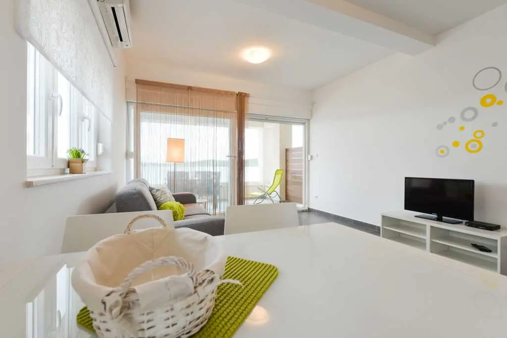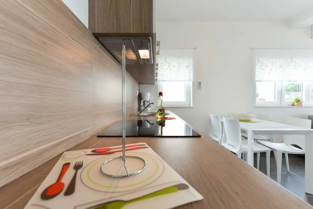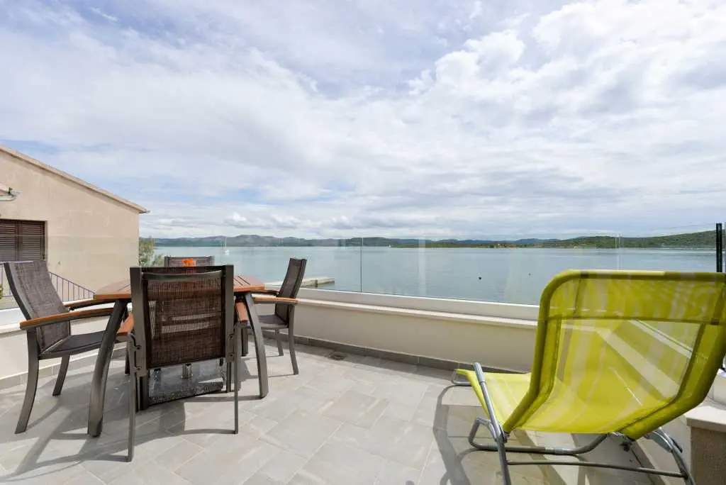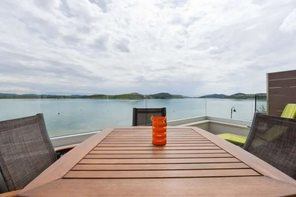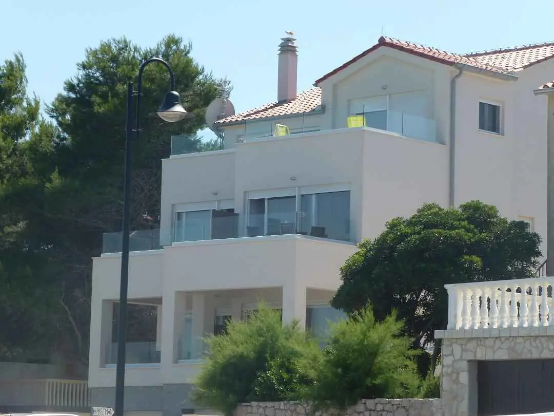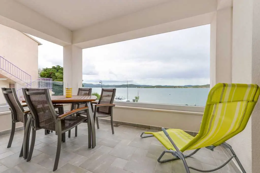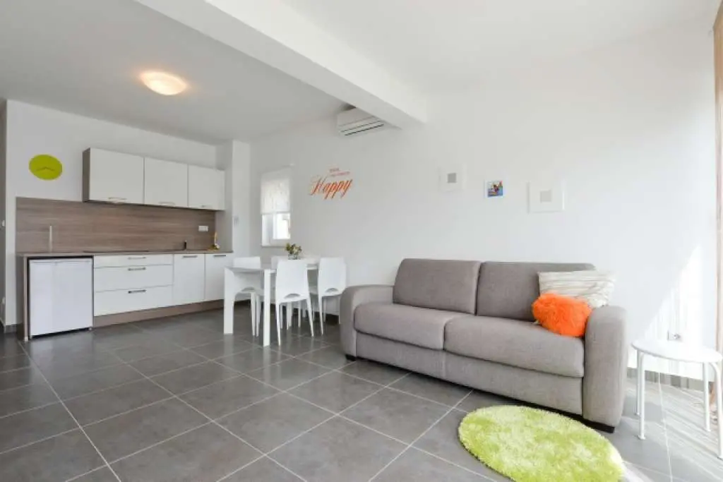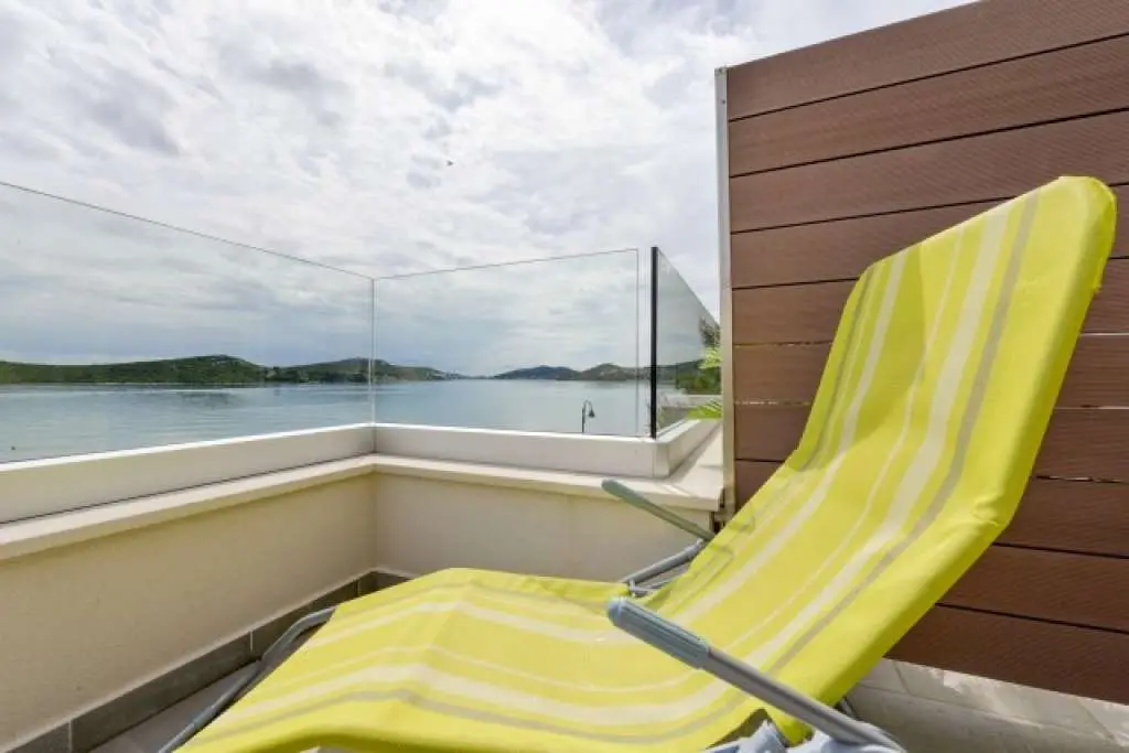 We will welcome you in the new build house located first row by the sea with four equipped and comfortable apartments of 40 m2 with 2 + 2 beds. You can enjoy on shady terrace, the barbecue and place for relaxation and fun in the garden. You have your own parking place and the possibility to use sun luongers and parasols for the beach. Also you can use bikes, sup and buoy. To the nearest sandy or rocky beach you will just have to cross one non-traffic street wich you can use, over the evening hours, for long walks or bike riding. At a distance of 300 m there are bars, restaurants, shops, the post office and the pharmacy.
