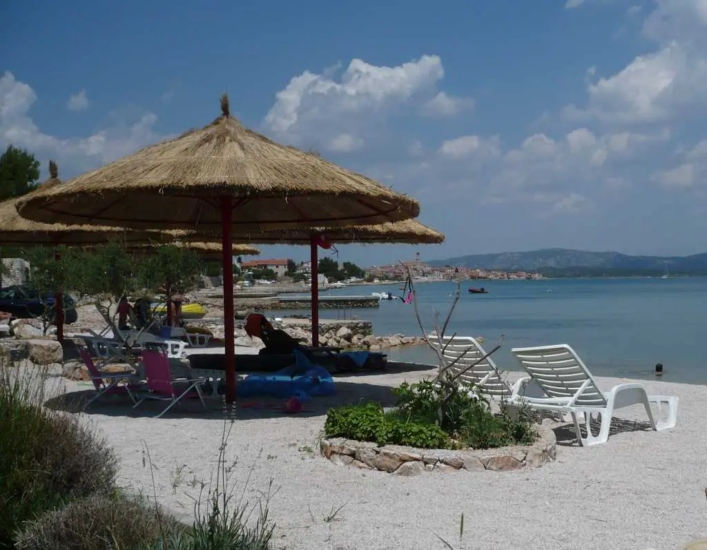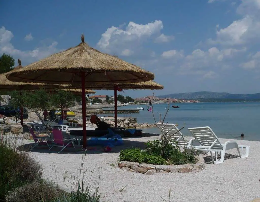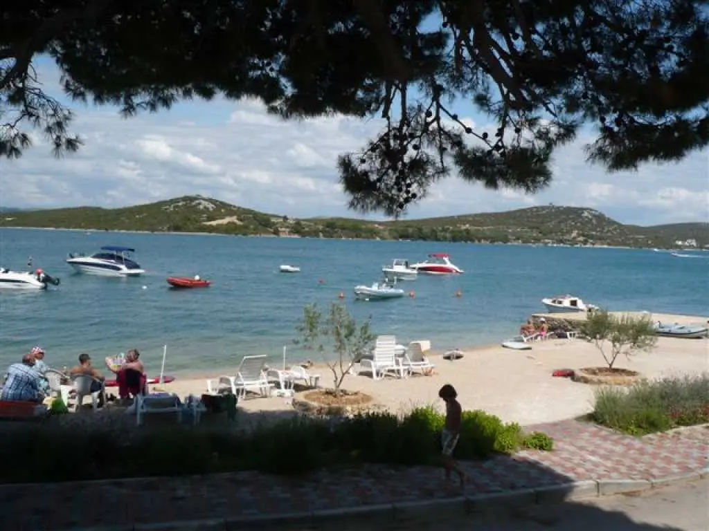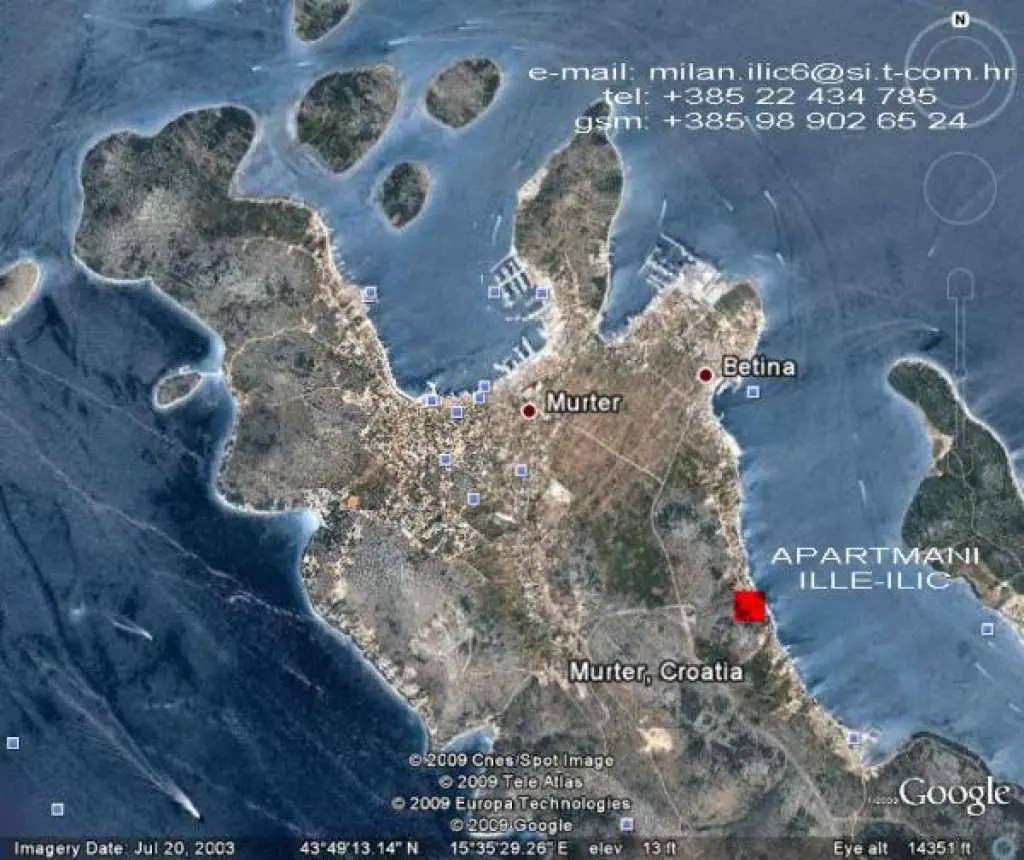 Betina on the island of Murter largest and closest island of the Sibenik archipelago. Beautiful beaches and untouched nature will make you at least some time in peace Betina bay. Lush Mediterranean vegetation, sun, sea and wind from the nearby Kornati (Kornati National Park) will make here, on the edge of the mysterious sea, at the foot of civilization and disobedient, pristine nature, once again feel the call of which has long been muffled deep within you. Our house has 4 apartments. It is located in Betina and is located near the sea. The building is only 20 meters away from the beach and 800 meters from the city center. It is open from 1.04 - 1.11. and is ideal for boat owners because the front of the house are 5 (buoys) and waterfront for entry and exit of vessels. All guests are happy and inspires them to swim close to the sea. Here you can spend pleasant moments with family or friends. Parking space is assured in front of the house. The house has wireless ADSL access. All apartments are equipped with air conditioning and satellite TV. The island has four seats, Betina, Murter, Jezera and Tisno. It is one of the most beautiful islands of the central Adriatic. Surrounded by National parks Kornati and Krka, and Vrana Lake Nature Park. The island is connected by a bridge (50 m) from the mainland and away from Sibenik, about 30 km and Zadar, about 60 km. To arrive by car we recommend the highway A1 - exit Pirovac (25 km) and the Jadranska magistrala - Kapela (11 km). The nearest airports are Zadar (60 km) and Split (100 km) Position: Latitude 43.81 ° N, Longitude 15.60 ° E