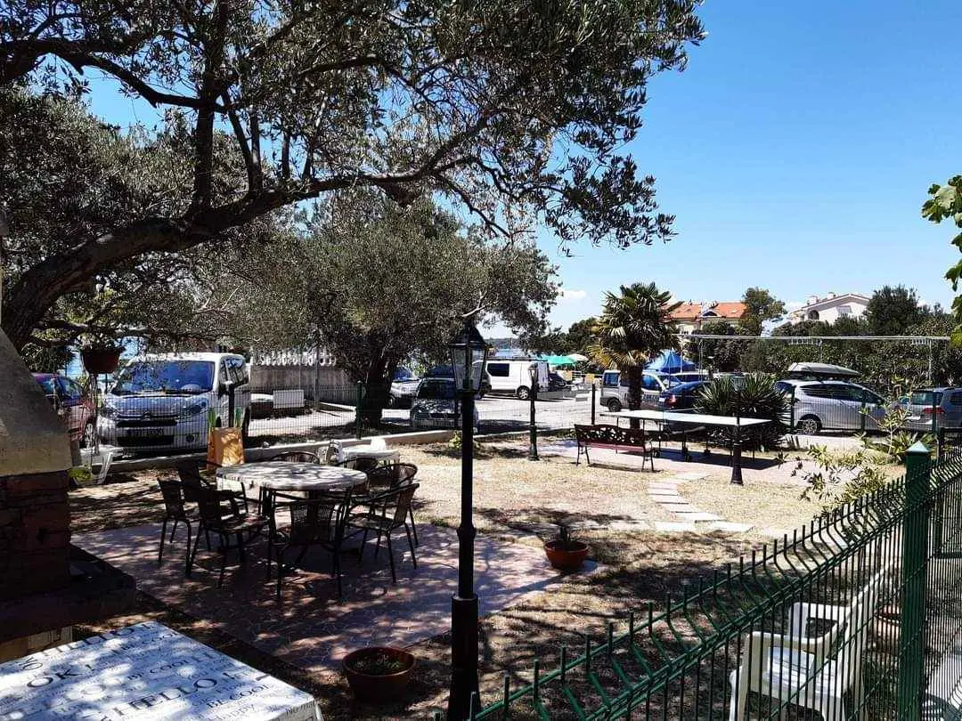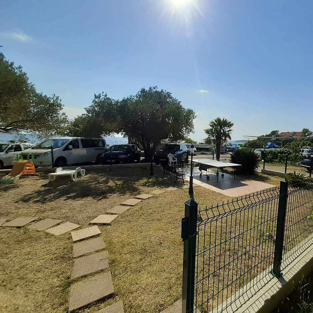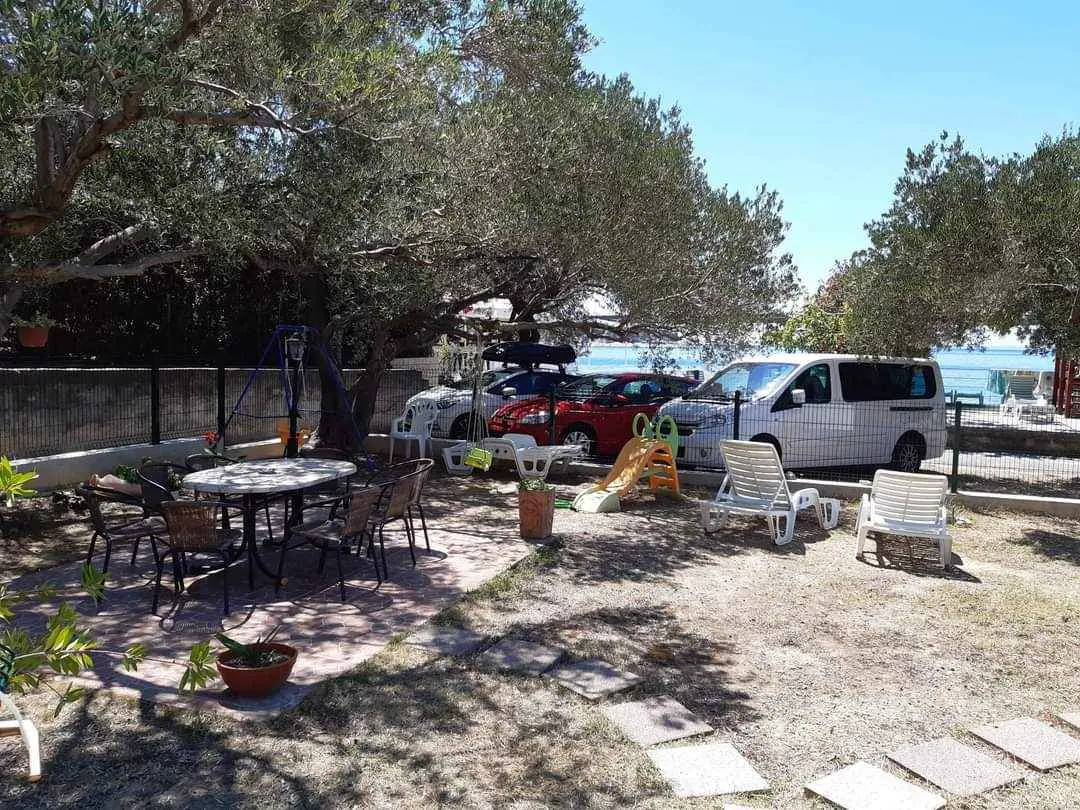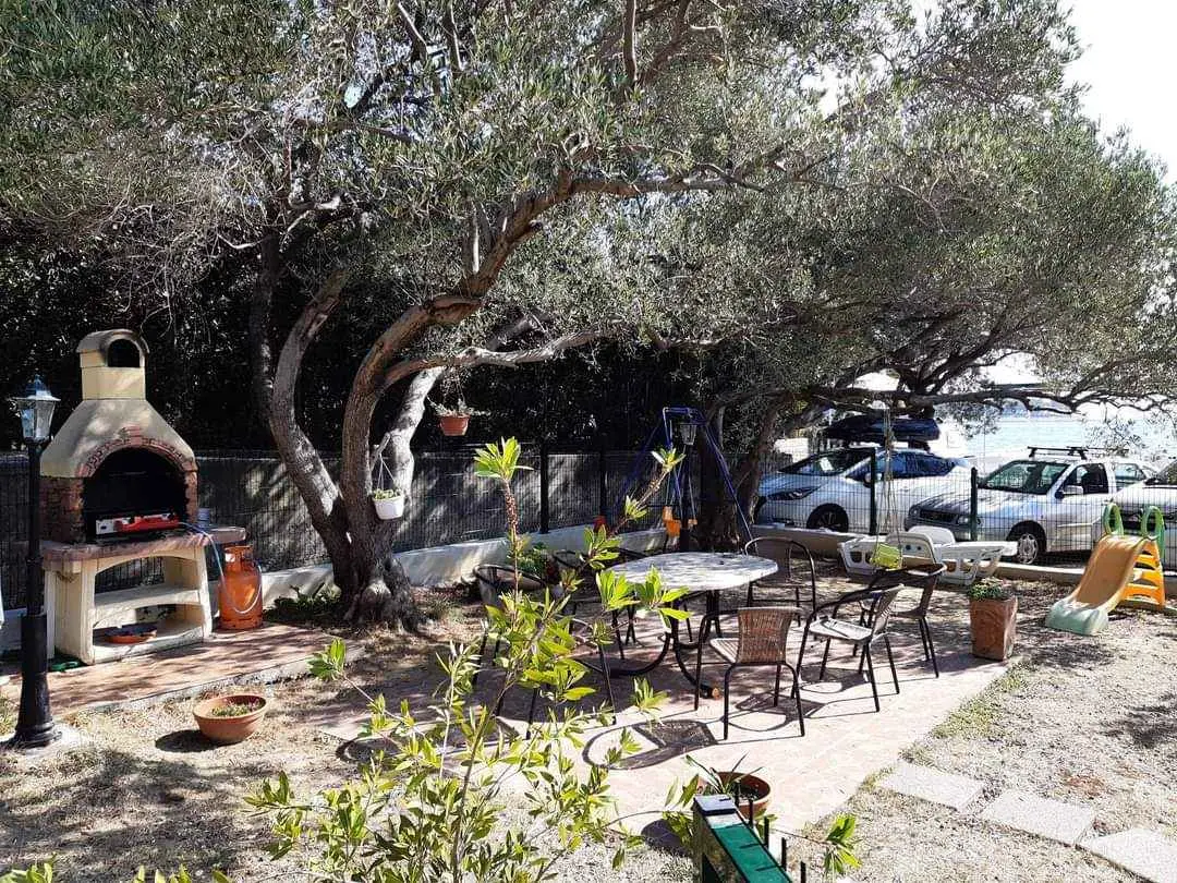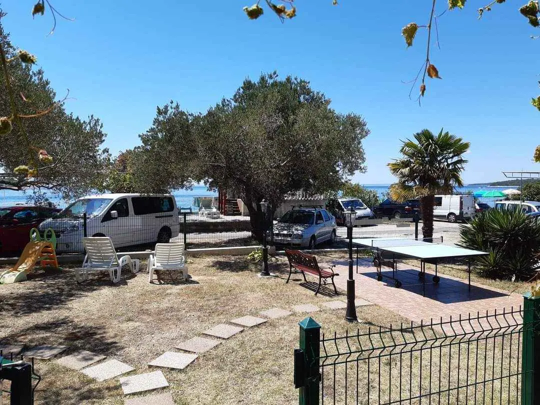 We are located by the bay Padova III on the island of Rab. Our guests can enjoy their stay in our apartments about 10 meters from the sea. Next to the beautiful sandy beach, there is our private terrace with deckchairs and from our balconies, you can have a fantastic view of the sea. Close by is fast food restaurant. In the garden under olive trees, there is a big barbecue with a table for having meals as well as swings and switchbacks for children and a table for table tennis.