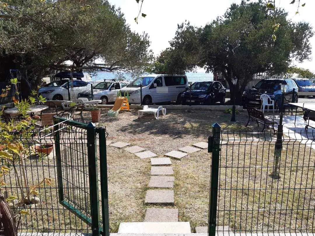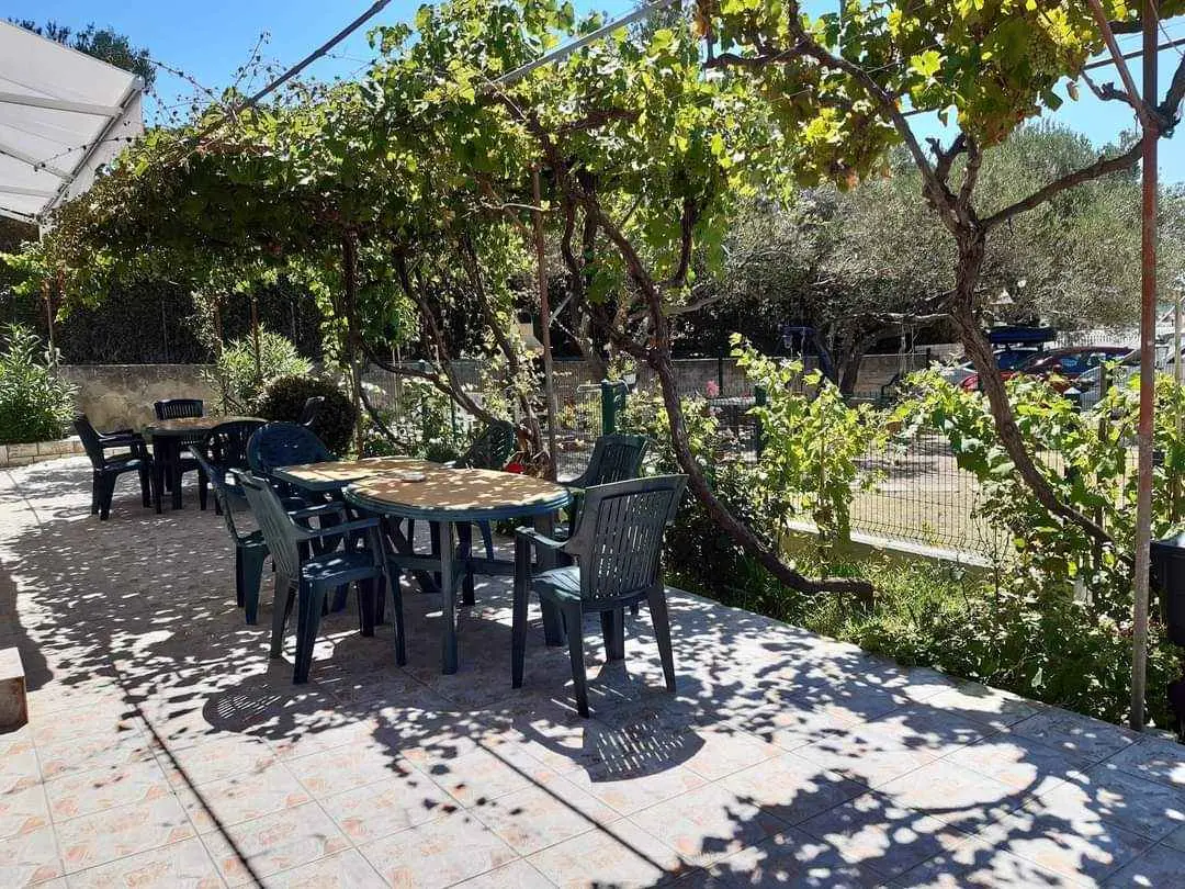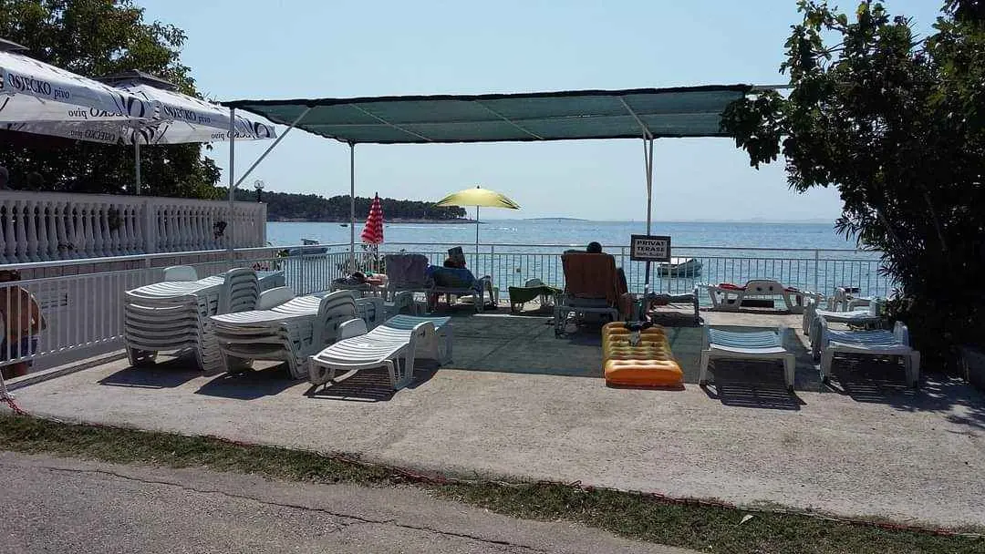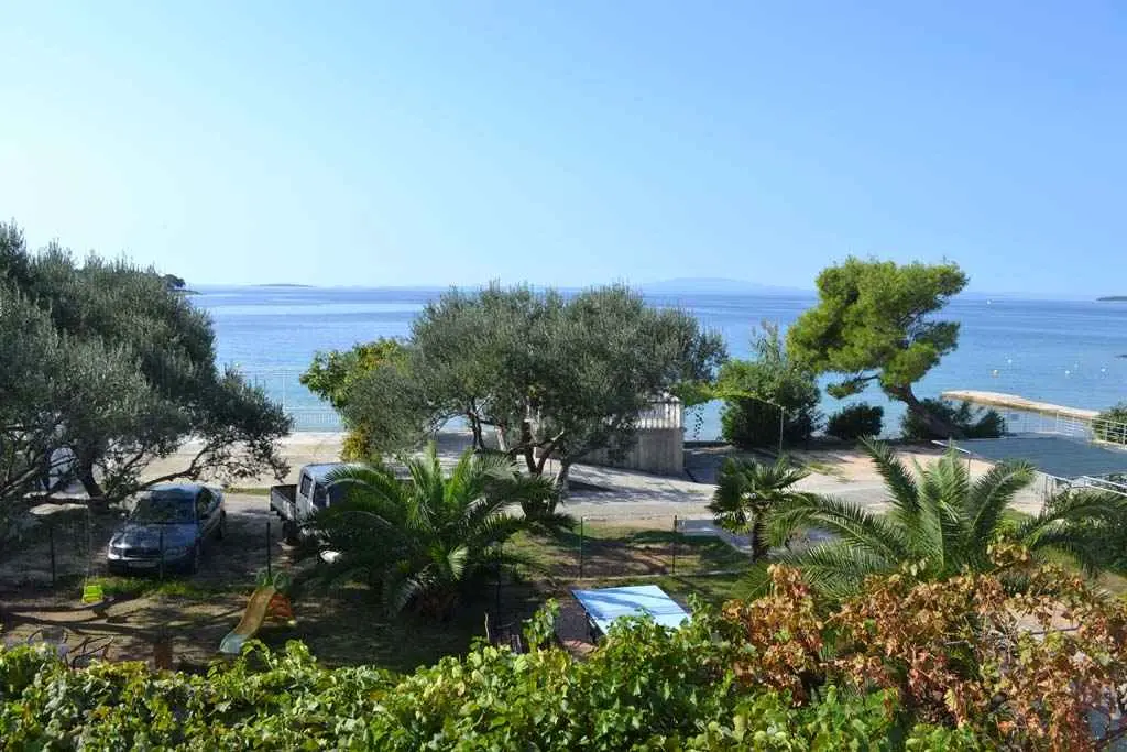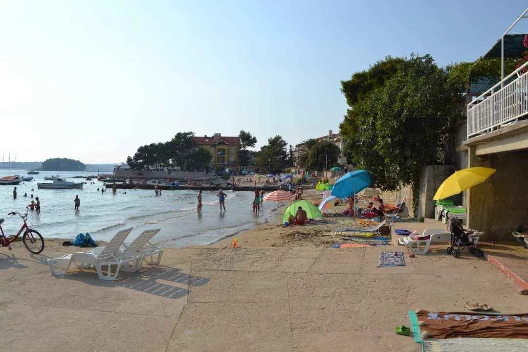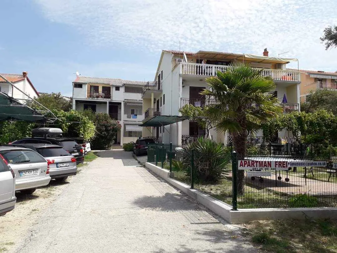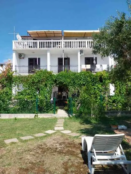 We are located by the bay Padova III on the island of Rab. Our guests can enjoy their stay in our apartments about 10 meters from the sea. Next to the beautiful sandy beach, there is our private terrace with deckchairs and from our balconies, you can have a fantastic view of the sea. Close by is fast food restaurant. In the garden under olive trees, there is a big barbecue with a table for having meals as well as swings and switchbacks for children and a table for table tennis.