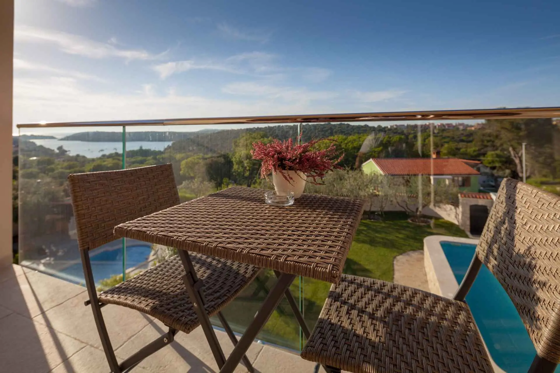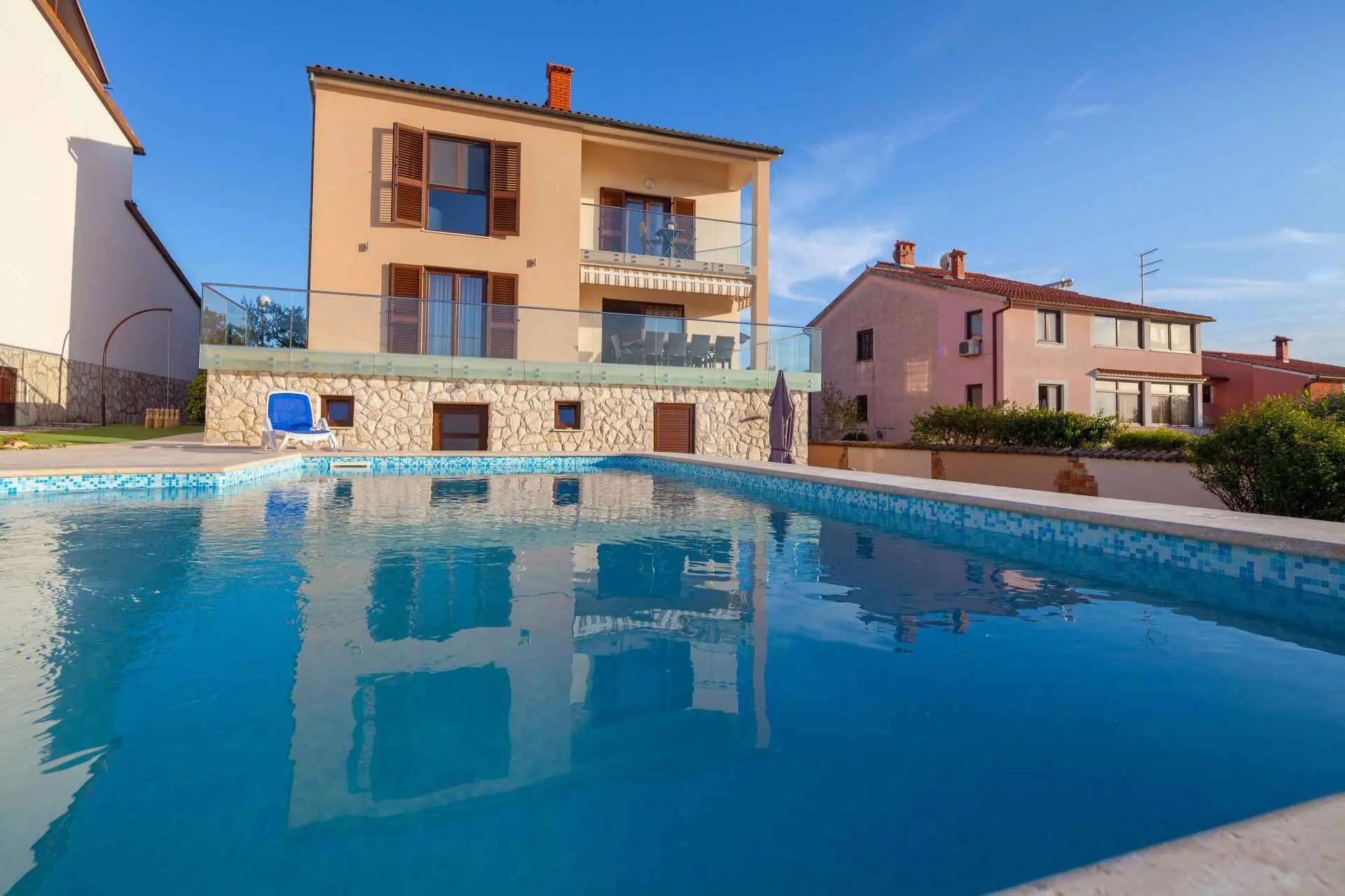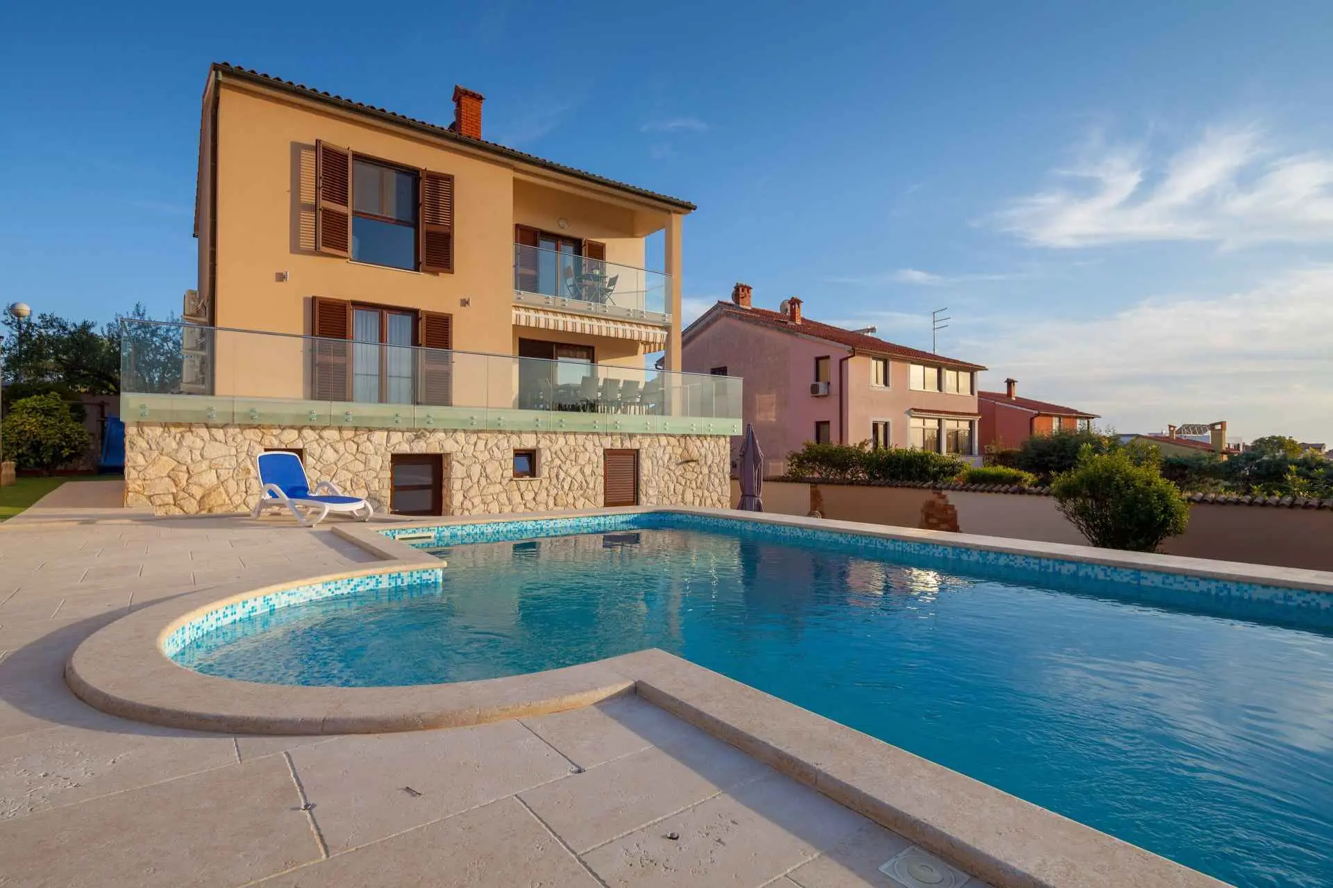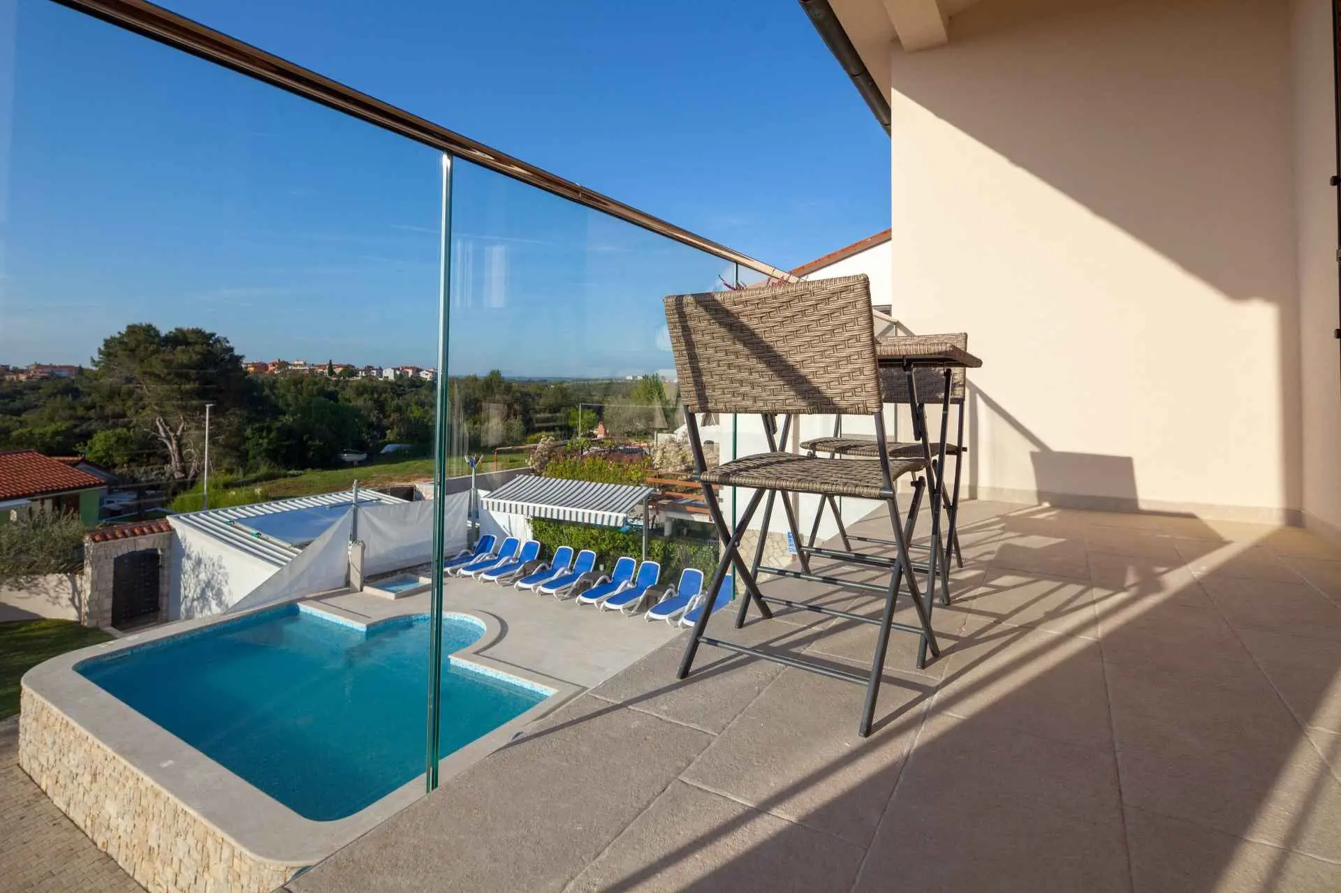 Spacious and refreshing villa with an amazing sea view, large pool with whirpool, sauna, game room with billiard for amazing vacation time Beautiful villa is based on 3 floors. Higher ground floor is the resting area with living room,large kitchen,winter terrace with indoor fireplace,garage, bathroom and a large open terrace with large dining table and a stunning view of the sea-Banjole's bay and natural suroundings. On the 1st floor there are 3 bedrooms and 2 bathroms. Each bedroom has balcony and view of the sea. From the outdoor terrace a staircase is leading to the garden area where is the large pool with jacuzzi and large sunbathing area with deckchairs. There is outside grill area and a place for relaxing. On the ground floor there are 2 more bedrooms each one with private bathroom, air condition, SAT TV. There is also game room with billiard, darts and table soccer. The garden area is walled and safe for children. The villa is located on one of the highest vantage points of the village which means it offers a stuning view of the sea and natural beauties. The area is safe and quiet which allows you to be relaxed during your stay. Nearest sea is just 800 meters away and in vicinity of not more then 2 kilometers there are many rocky and sandy beaches, campsites, wild beaches. Near the property is one small shop for everything you need and just 1 km away there is larger supermarket,gas staion,bank,ATM. Whirpool inside the swimming pool, wellness room with sauna and shower, game room with biliard, table soccer, darts, garage + 2 parking spaces, outside grill on coal or gas, inside fireplace on the large winter terrace.
