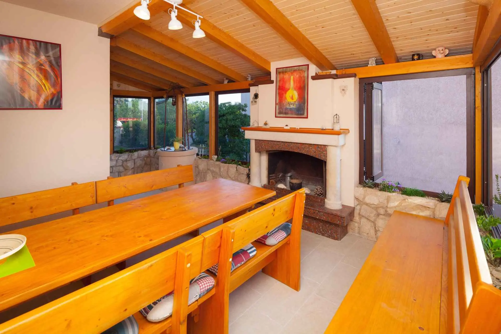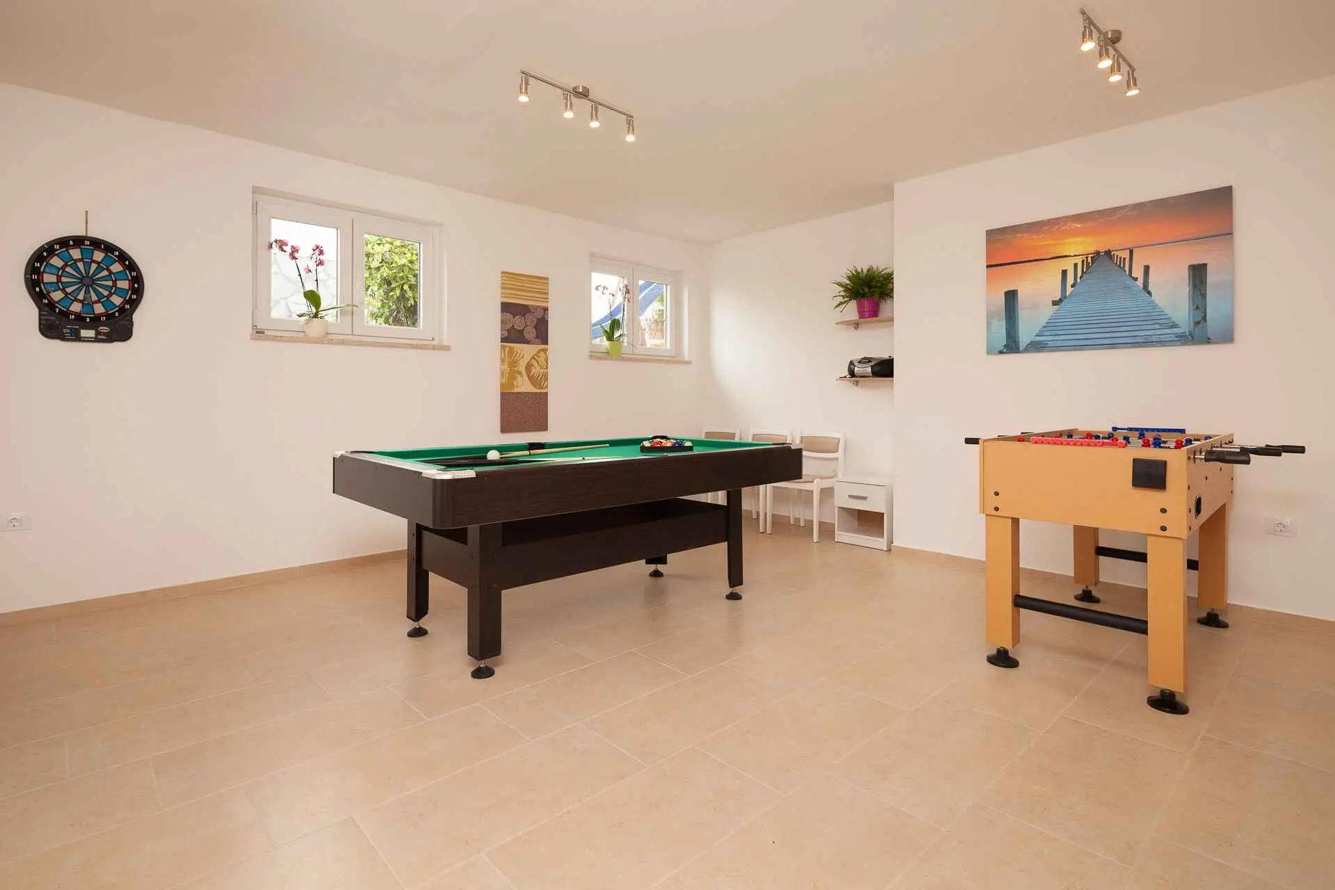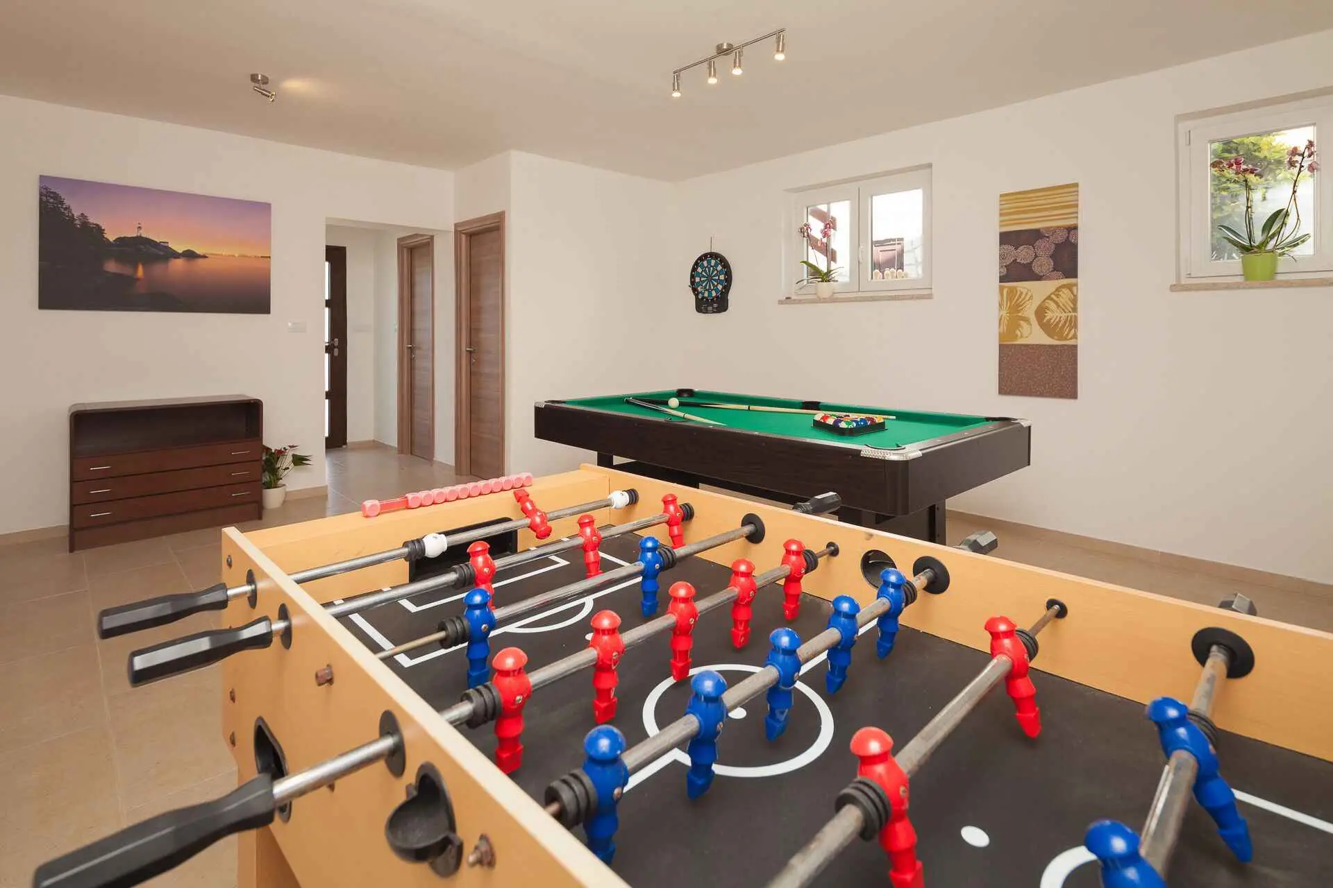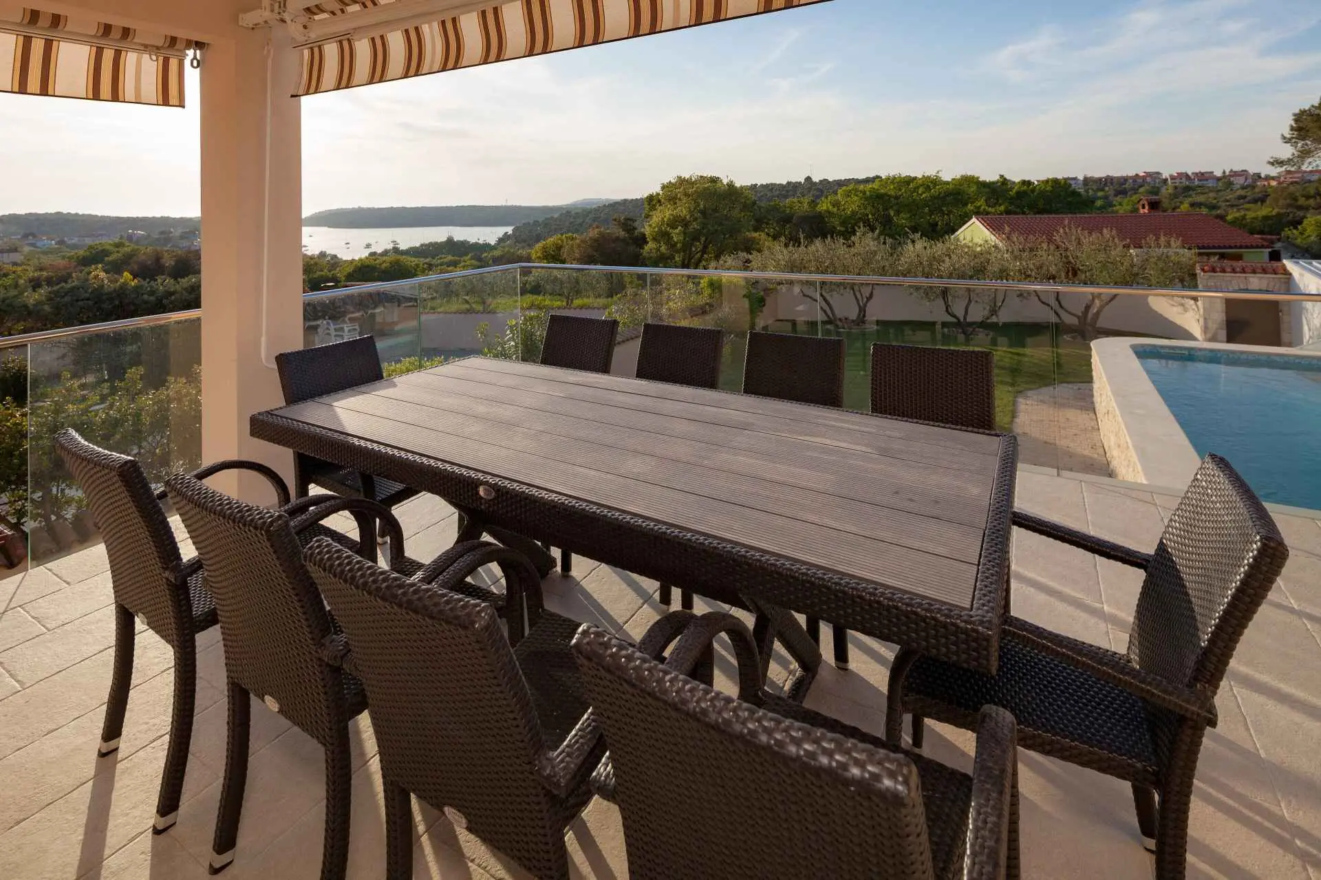Spacious and refreshing villa with an amazing sea view, large pool with whirpool, sauna, game room with billiard for amazing vacation time Beautiful villa is based on 3 floors. Higher ground floor is the resting area with living room,large kitchen,winter terrace with indoor fireplace,garage, bathroom and a large open terrace with large dining table and a stunning view of the sea-Banjole's bay and natural suroundings. On the 1st floor there are 3 bedrooms and 2 bathroms. Each bedroom has balcony and view of the sea. From the outdoor terrace a staircase is leading to the garden area where is the large pool with jacuzzi and large sunbathing area with deckchairs. There is outside grill area and a place for relaxing. On the ground floor there are 2 more bedrooms each one with private bathroom, air condition, SAT TV. There is also game room with billiard, darts and table soccer. The garden area is walled and safe for children. The villa is located on one of the highest vantage points of the village which means it offers a stuning view of the sea and natural beauties. The area is safe and quiet which allows you to be relaxed during your stay. Nearest sea is just 800 meters away and in vicinity of not more then 2 kilometers there are many rocky and sandy beaches, campsites, wild beaches. Near the property is one small shop for everything you need and just 1 km away there is larger supermarket,gas staion,bank,ATM. Whirpool inside the swimming pool, wellness room with sauna and shower, game room with biliard, table soccer, darts, garage + 2 parking spaces, outside grill on coal or gas, inside fireplace on the large winter terrace.