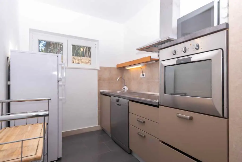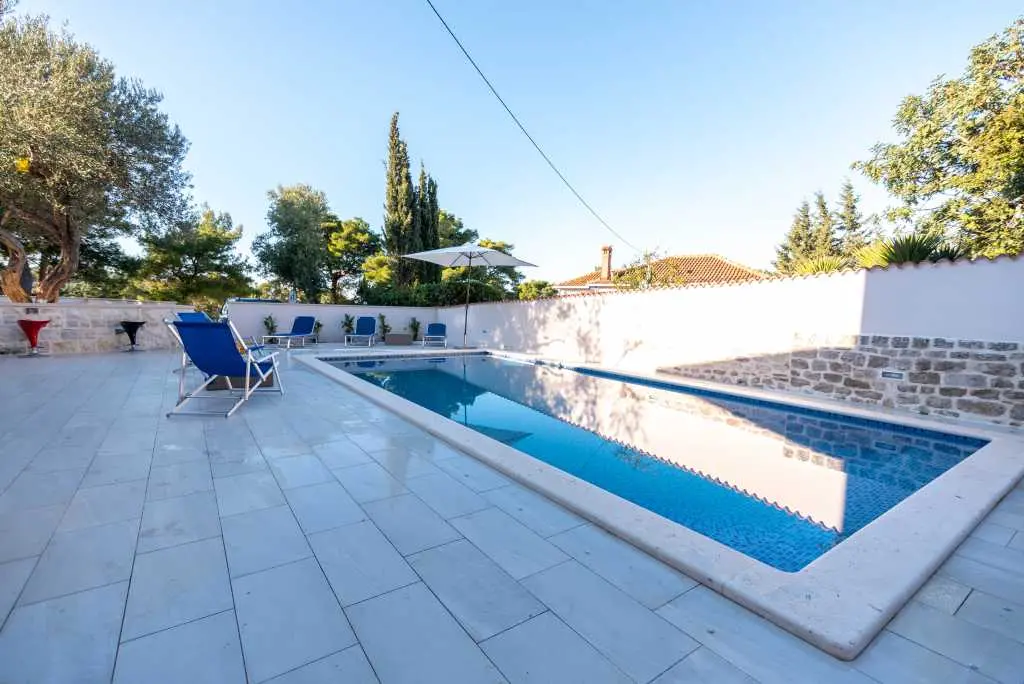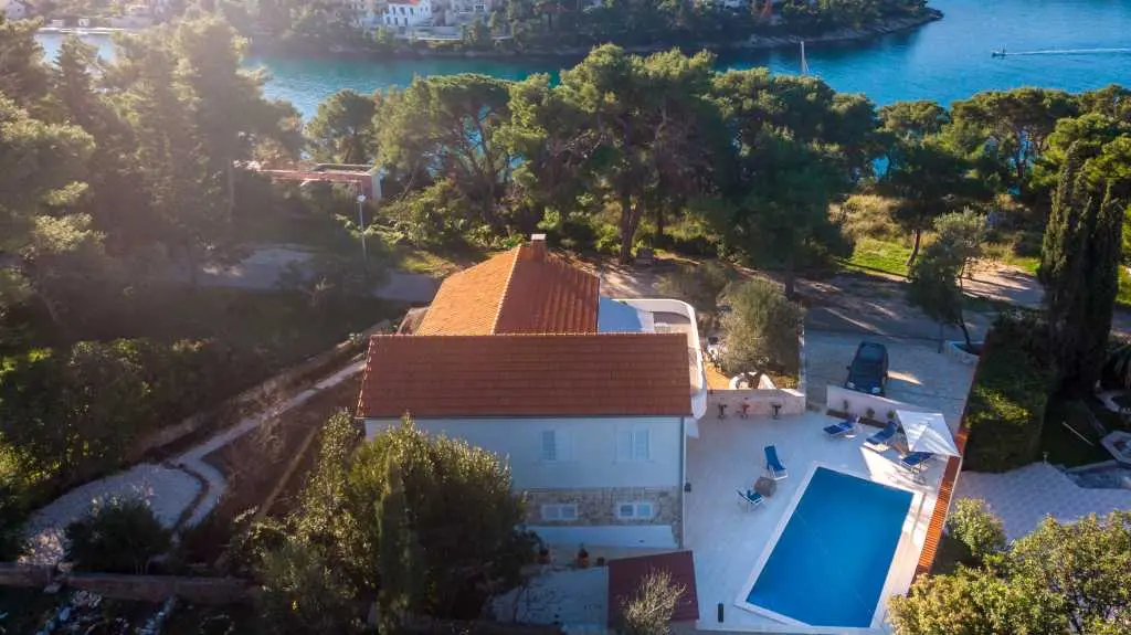 Villa consists of 2 floors with total 5 bedrooms, 3 bathrooms, 2 living rooms, big terrace on first floor and big pool with amazing stone plated yard around it. On first floor there are 3 bedrooms, all with double beds. There is fully equipped kitchen with big living room and amazing piano which exits to sunny terrace. On the ground floor there are 2 bedrooms, 1 with double beds and second with single bed. Villa has big POOL of 30 m^2 in front of it with sunbeds and siting area around it. DETAILS: Welcome to Villa Lidia, which is located in a quiet cove small picturesque place called Splitska. This place is the oldest known port on the island of Brač that was active during the building of Diocletian's palace in the distant 3rd century. Villa is located on the right side of the bay, in a pine forest and is only 50 meters from the sea. Villa has a large pool & which is surrounded with stone paved yard on which there is a fireplace, table with chairs under the olive tree, an outdoor shower and sunbeds. From stone pave you enter ground floor which consists of 2 bedrooms, 1 with double beds and second with single bed. There is small new kitchen and dining place with table and 5 chairs. Also there is full bathrooms. On first floor there are 3 bedrooms, all with double beds. There is fully equipped kitchen with big living room. In living room there is amazing artistic sofa, dining table with 6 chairs and amazing piano on which you can play, if you have the will and knowledge :). From living room you can exit to big sunny terrace of some 80^m on which there are two seating sets and from booth of the you can observe sea, pool, pine tress and totally relax. There is free private parking for 2 cars in front of the villa and more free parking space on public free parking 10 meters from villa entrance. First beach is 5 minutes away by walking and center of village with cafe bars, restaurants and shop is 8 minutes away.