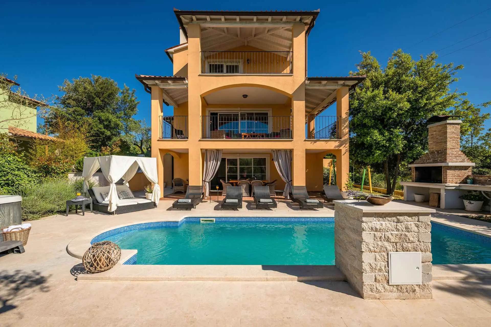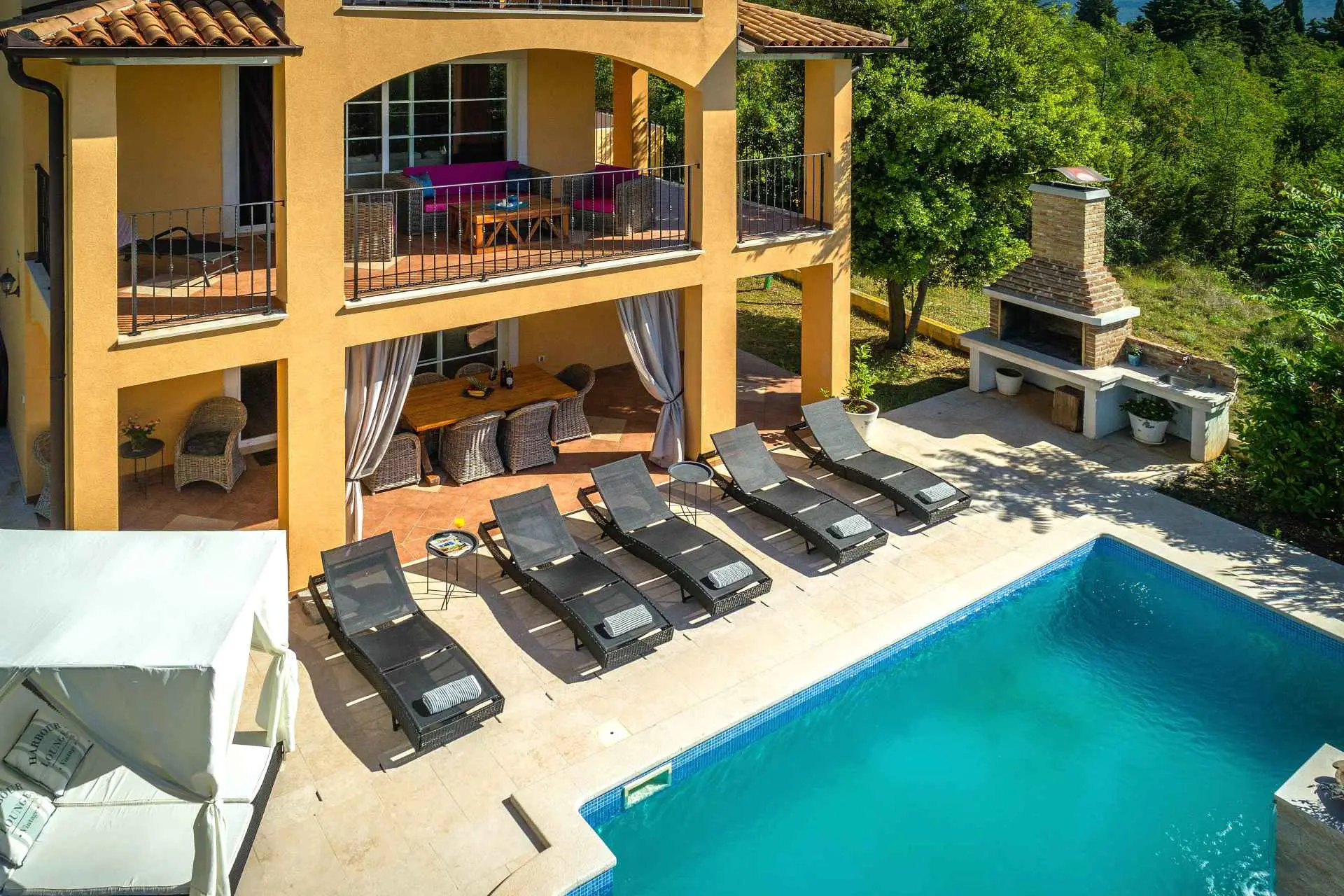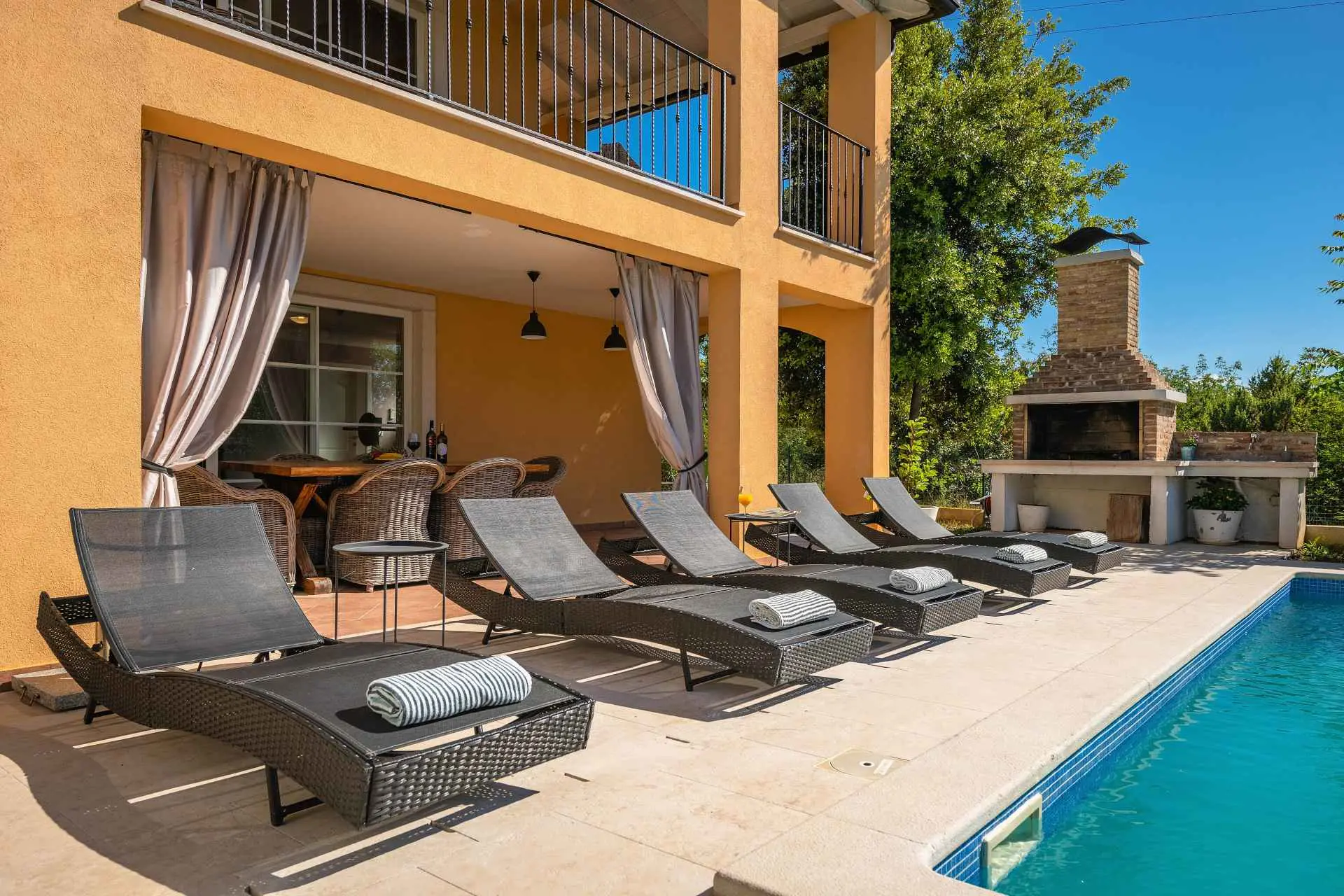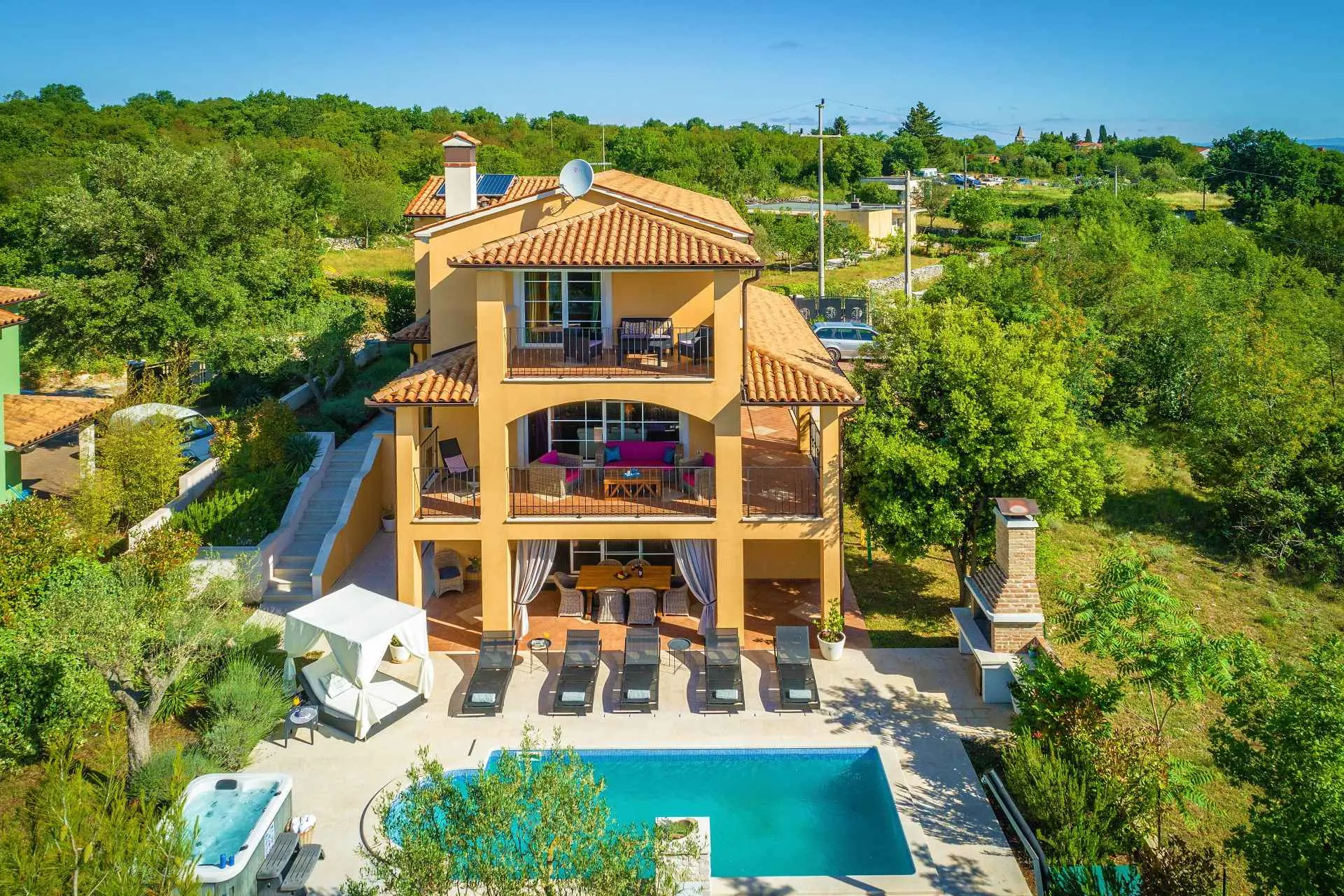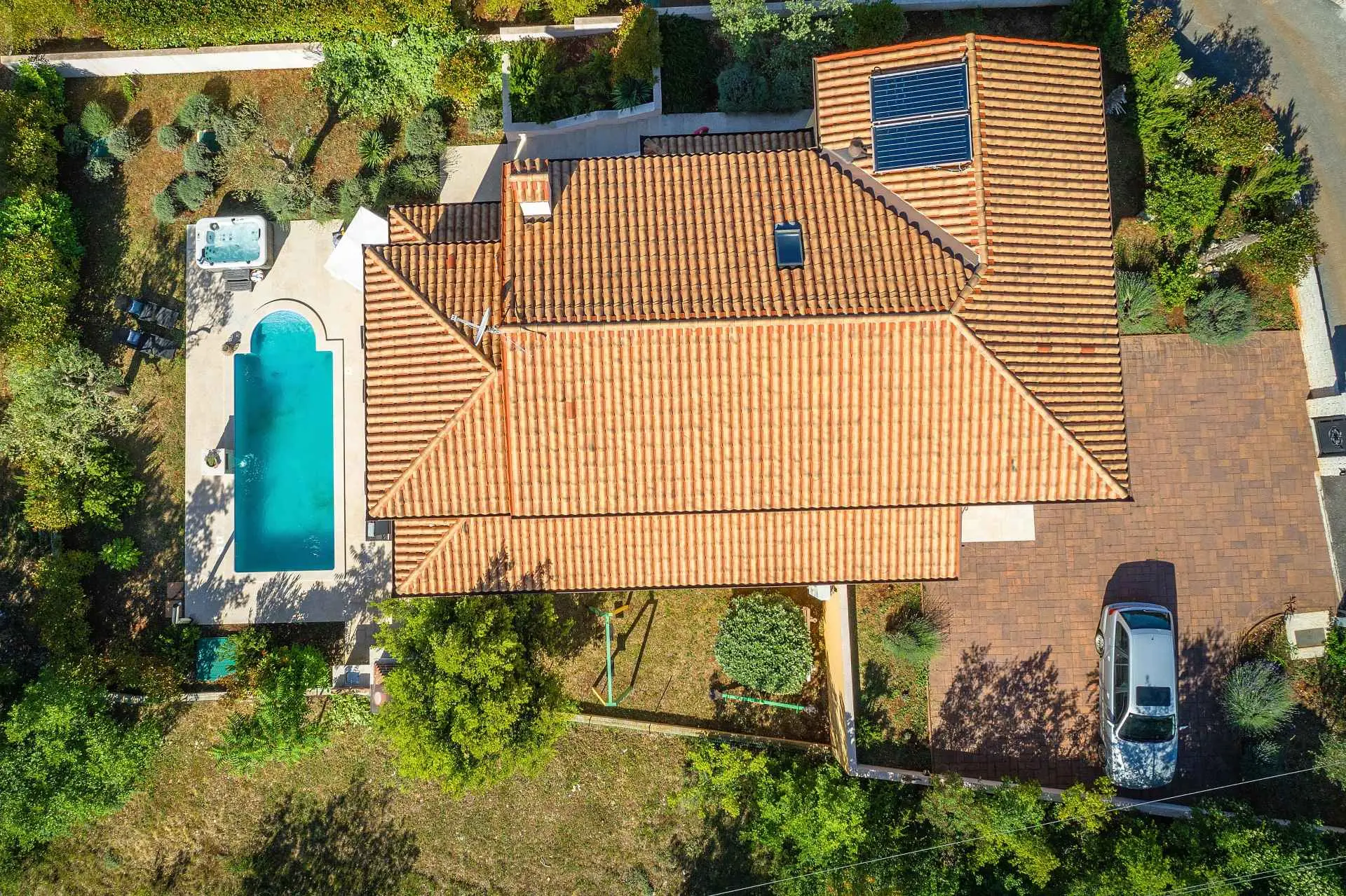 The charming 320m² villa is located in Rakalj, a quiet village on the east coast of Istria, with a beautiful view of Kvarner and the island of Cres, as well as the Ucka Mountains. Air-conditioned bedrooms, WiFi flat, pool, fitness and much more. The charming 320m² villa is located in Rakalj, a quiet village on the east coast of Istria, with a beautiful view of Kvarner and the island of Cres, as well as the Ucka Mountains. The villa is equipped with four air-conditioned bedrooms each with a bathroom, safe, alarm system, three terraces, pool without heating, heated jacuzzi, gym, sauna with shower, living room with dining area, kitchen, playground and billiard table - for up to 10 guests. Bed linen and towels are included