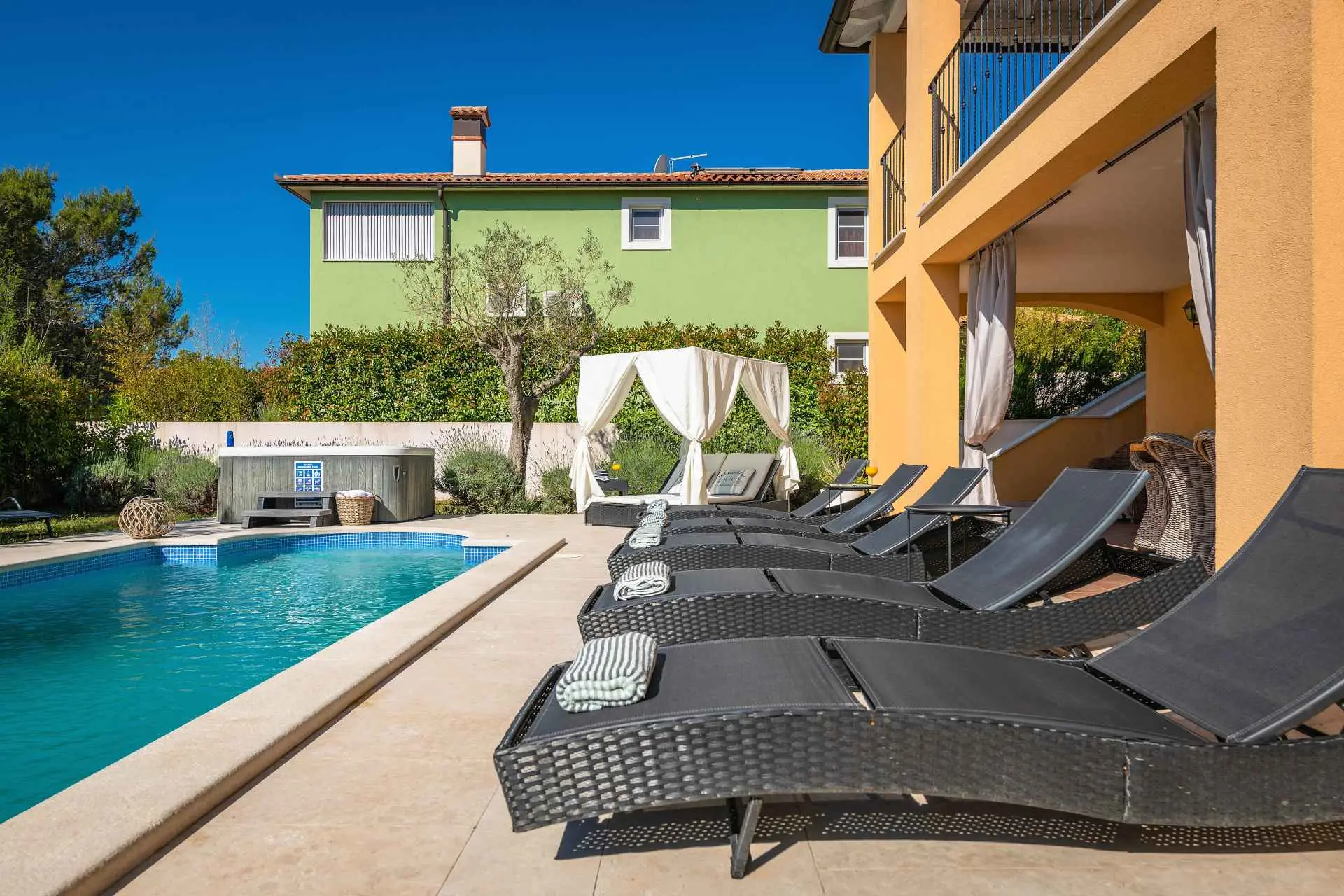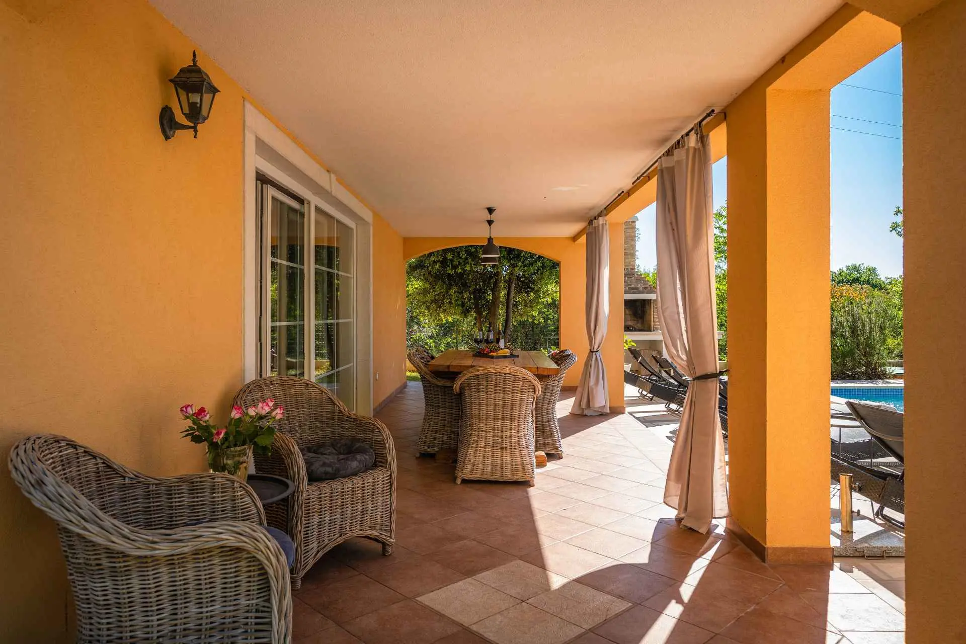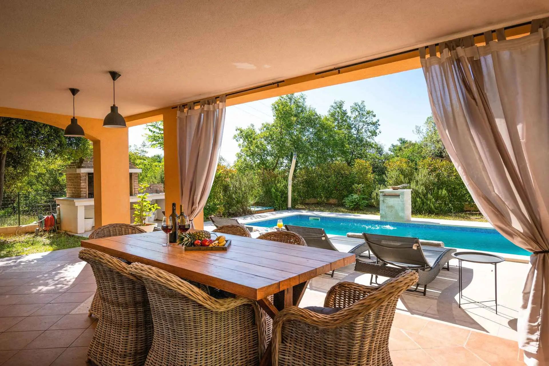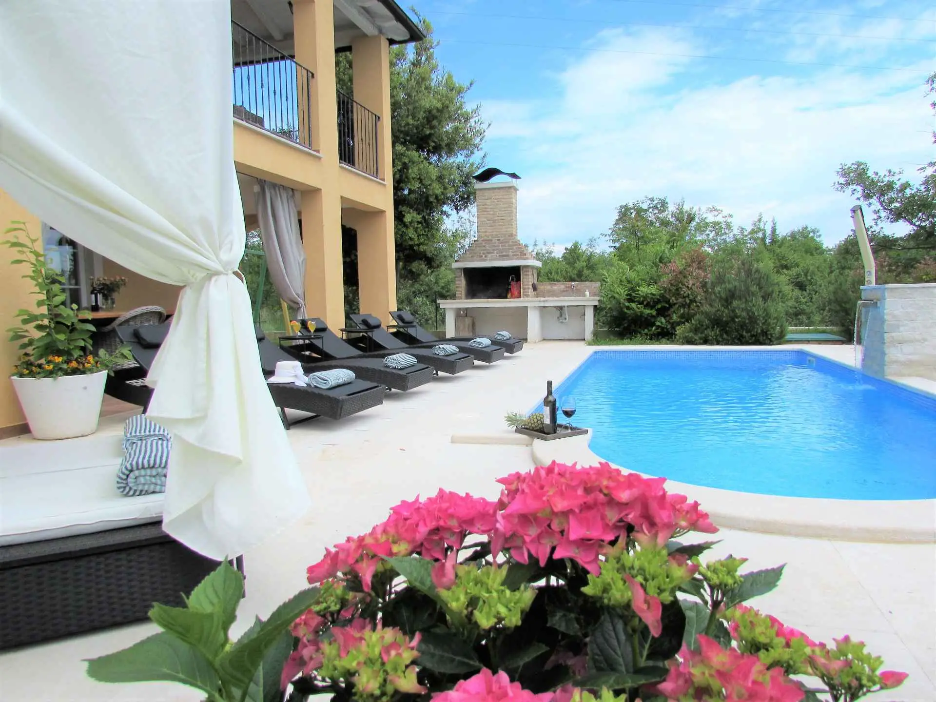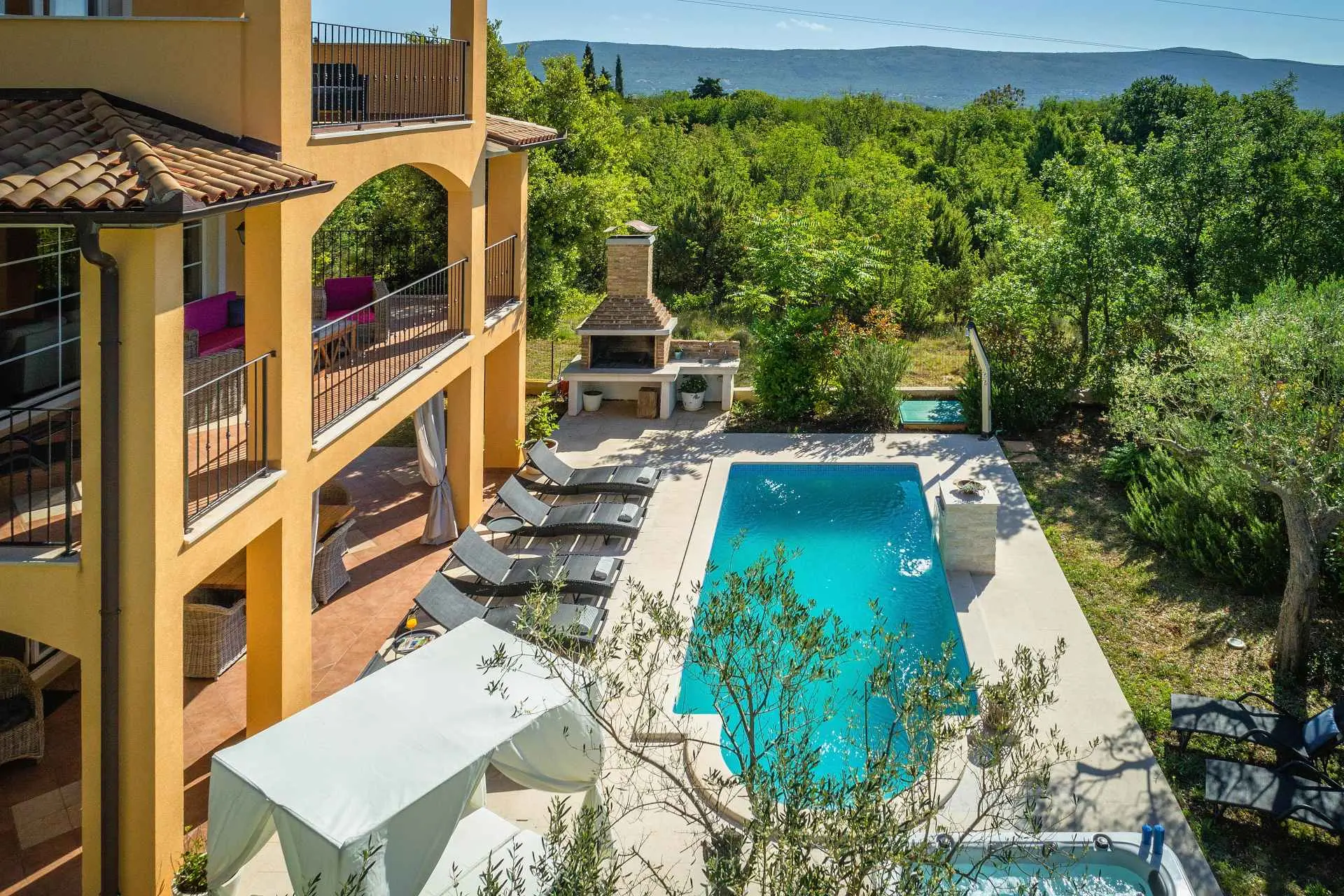 The charming 320m² villa is located in Rakalj, a quiet village on the east coast of Istria, with a beautiful view of Kvarner and the island of Cres, as well as the Ucka Mountains. Air-conditioned bedrooms, WiFi flat, pool, fitness and much more. The charming 320m² villa is located in Rakalj, a quiet village on the east coast of Istria, with a beautiful view of Kvarner and the island of Cres, as well as the Ucka Mountains. The villa is equipped with four air-conditioned bedrooms each with a bathroom, safe, alarm system, three terraces, pool without heating, heated jacuzzi, gym, sauna with shower, living room with dining area, kitchen, playground and billiard table - for up to 10 guests. Bed linen and towels are included