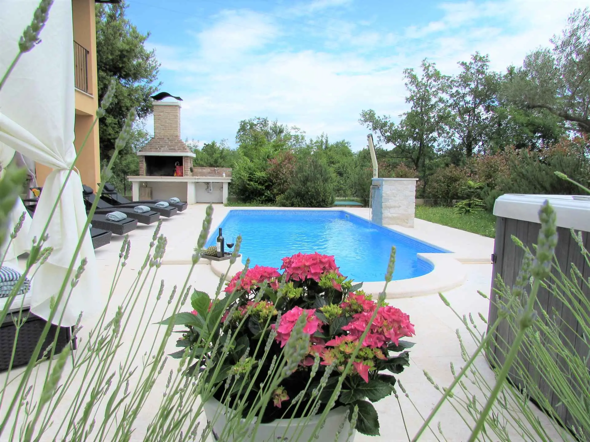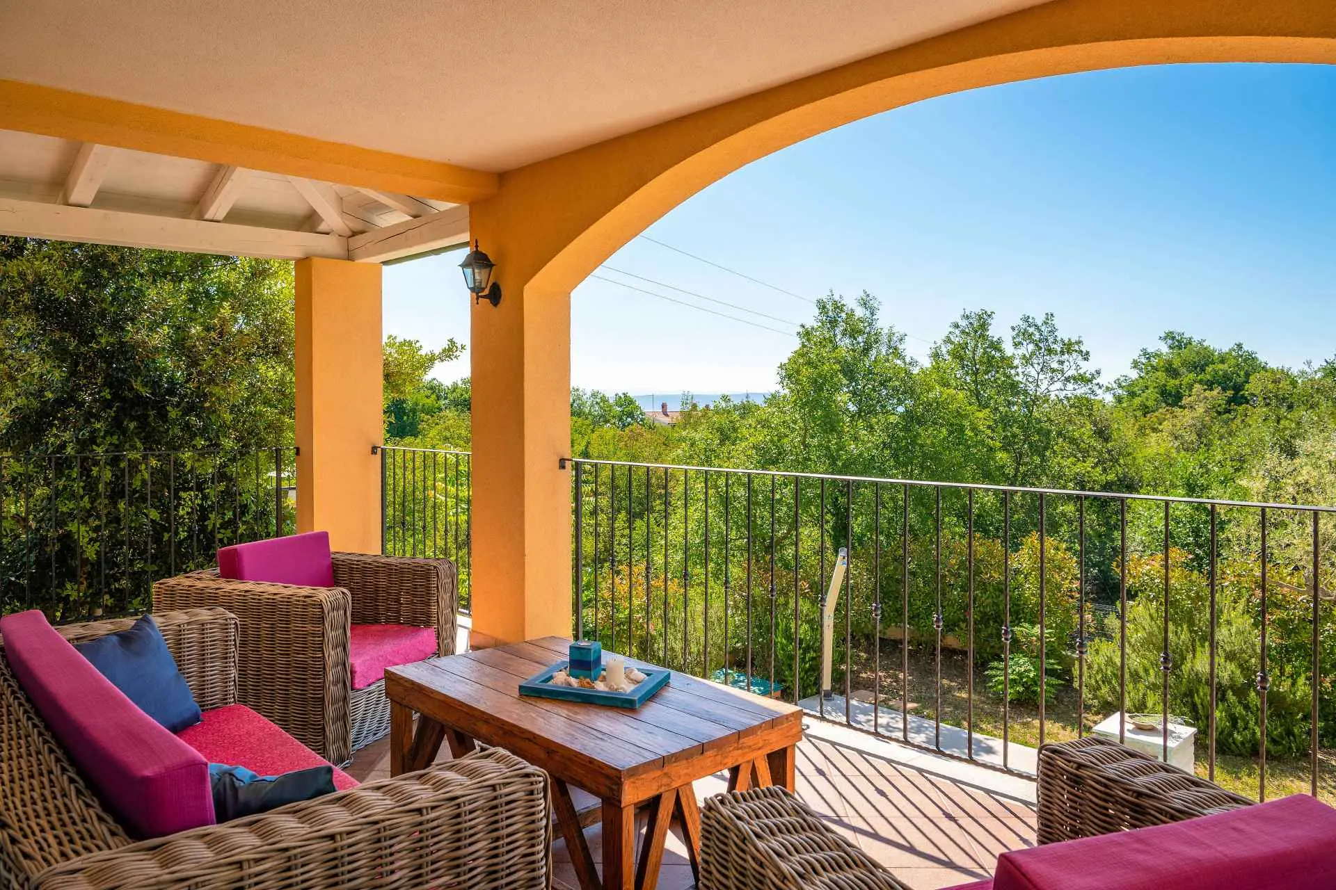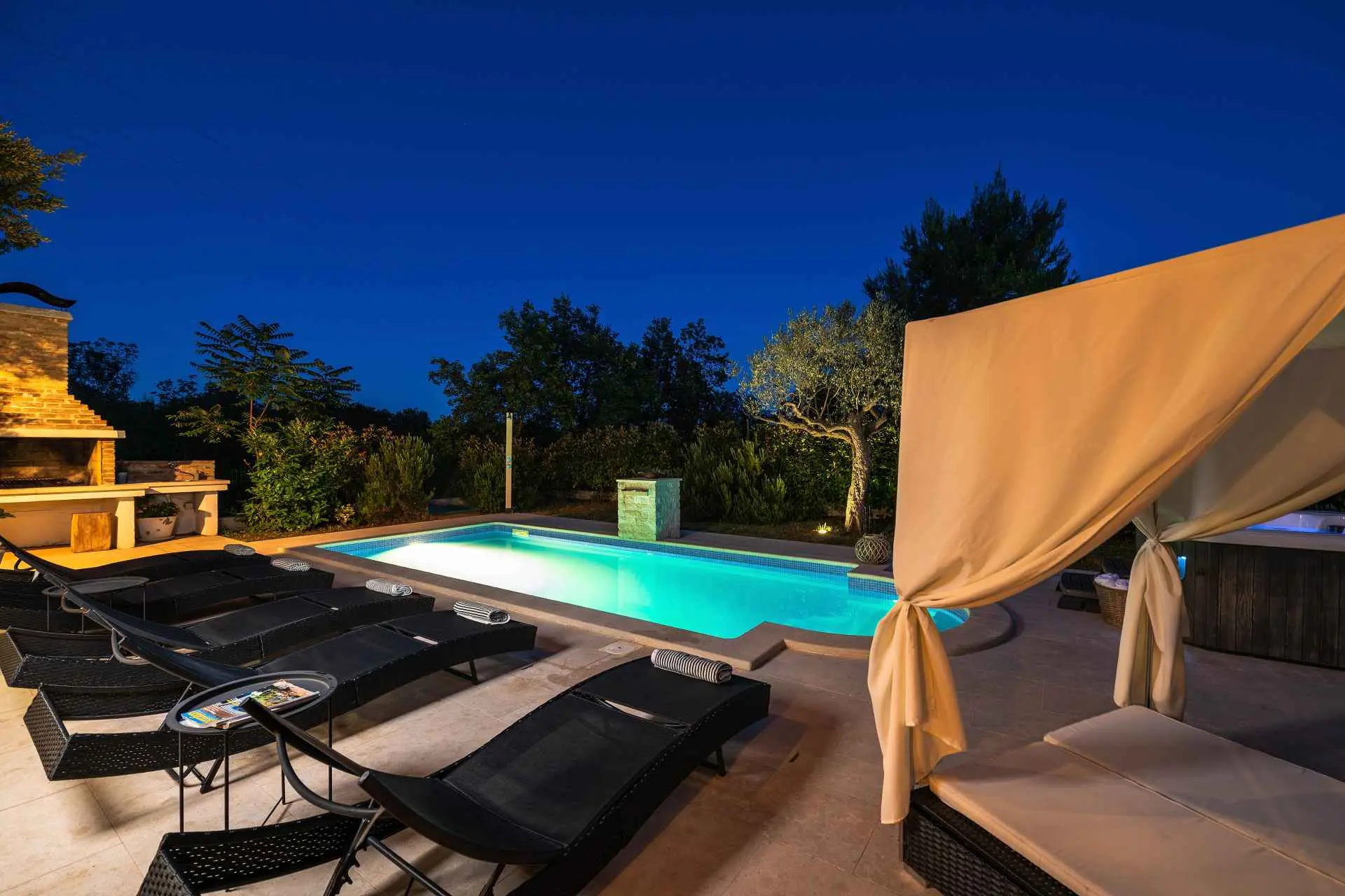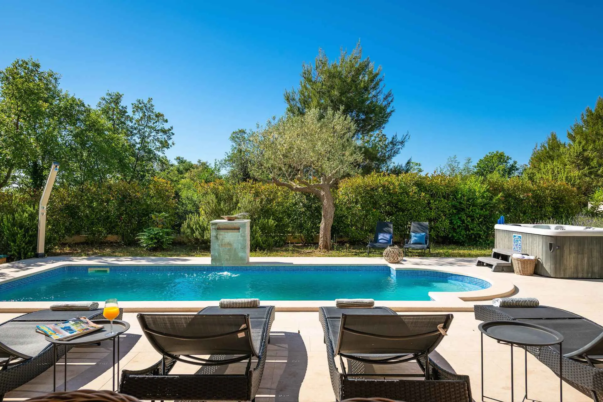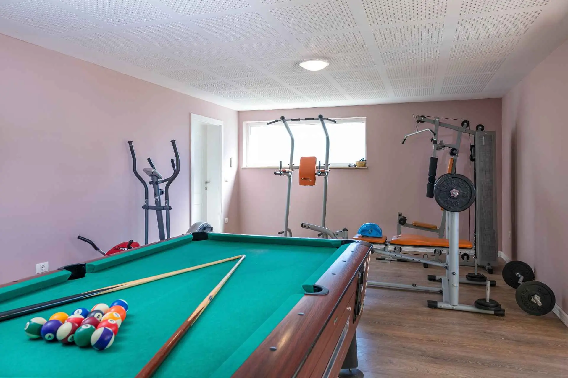 The charming 320m² villa is located in Rakalj, a quiet village on the east coast of Istria, with a beautiful view of Kvarner and the island of Cres, as well as the Ucka Mountains. Air-conditioned bedrooms, WiFi flat, pool, fitness and much more. The charming 320m² villa is located in Rakalj, a quiet village on the east coast of Istria, with a beautiful view of Kvarner and the island of Cres, as well as the Ucka Mountains. The villa is equipped with four air-conditioned bedrooms each with a bathroom, safe, alarm system, three terraces, pool without heating, heated jacuzzi, gym, sauna with shower, living room with dining area, kitchen, playground and billiard table - for up to 10 guests. Bed linen and towels are included