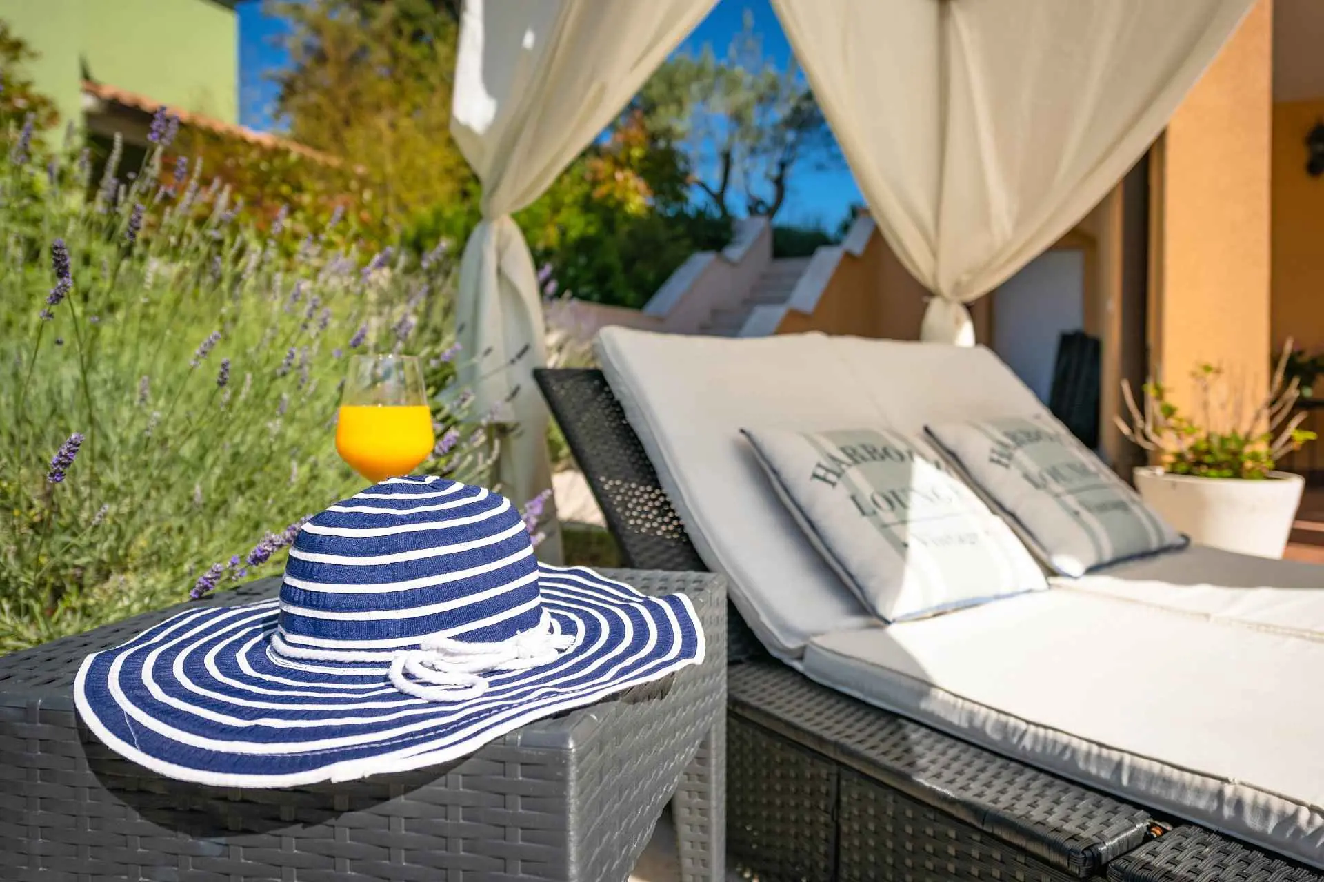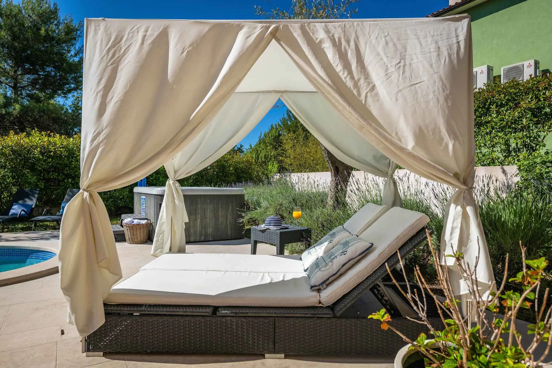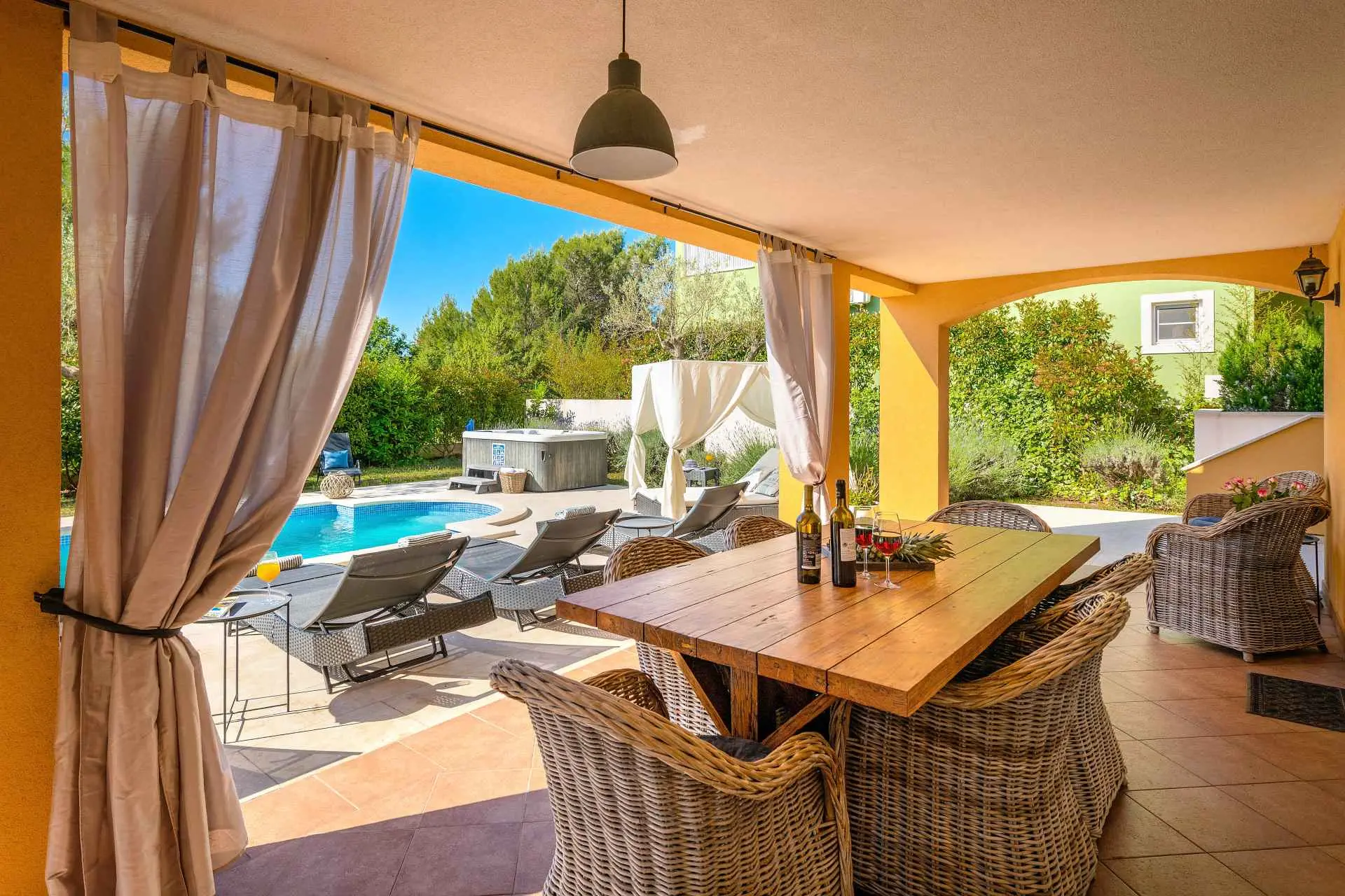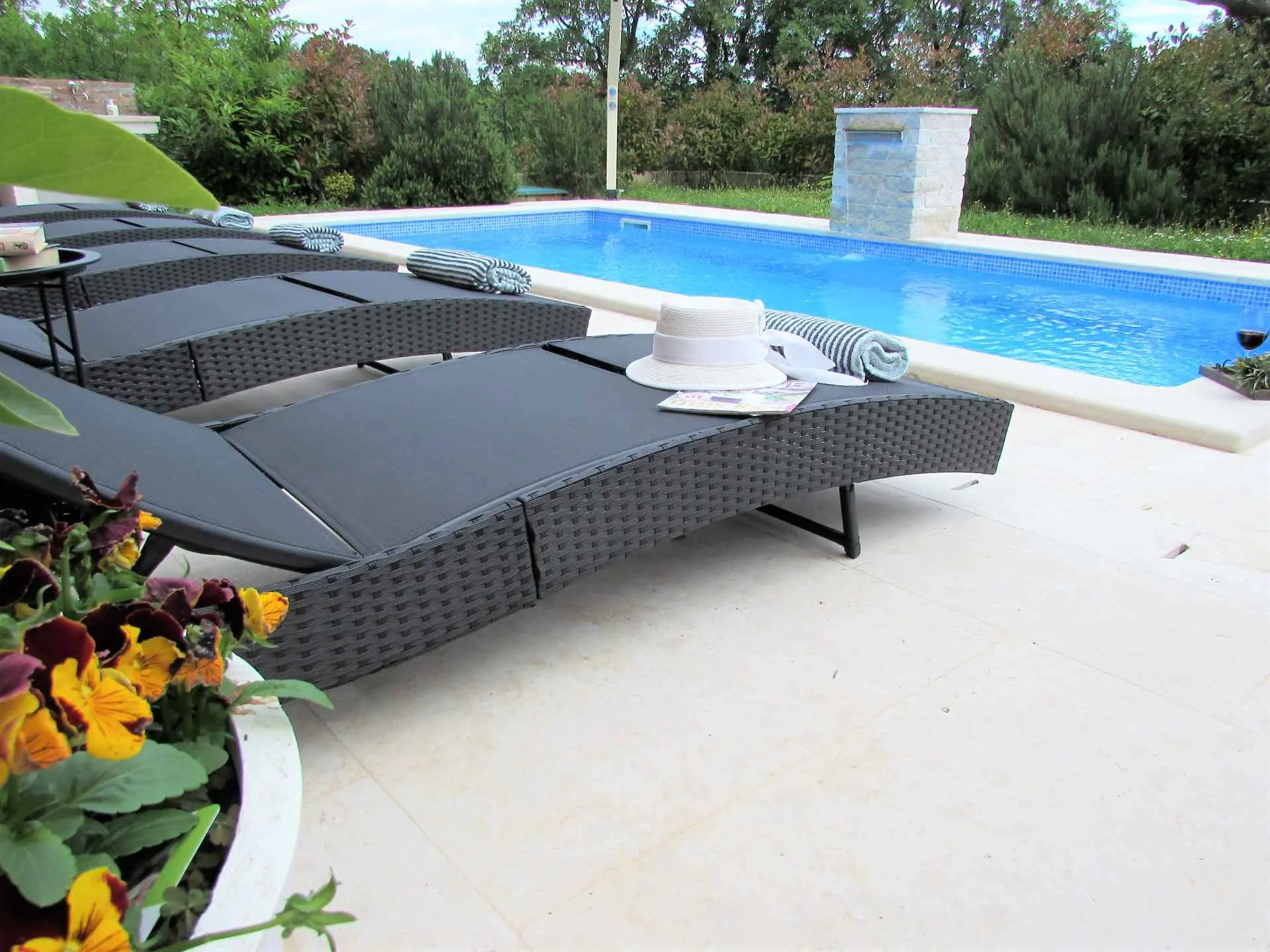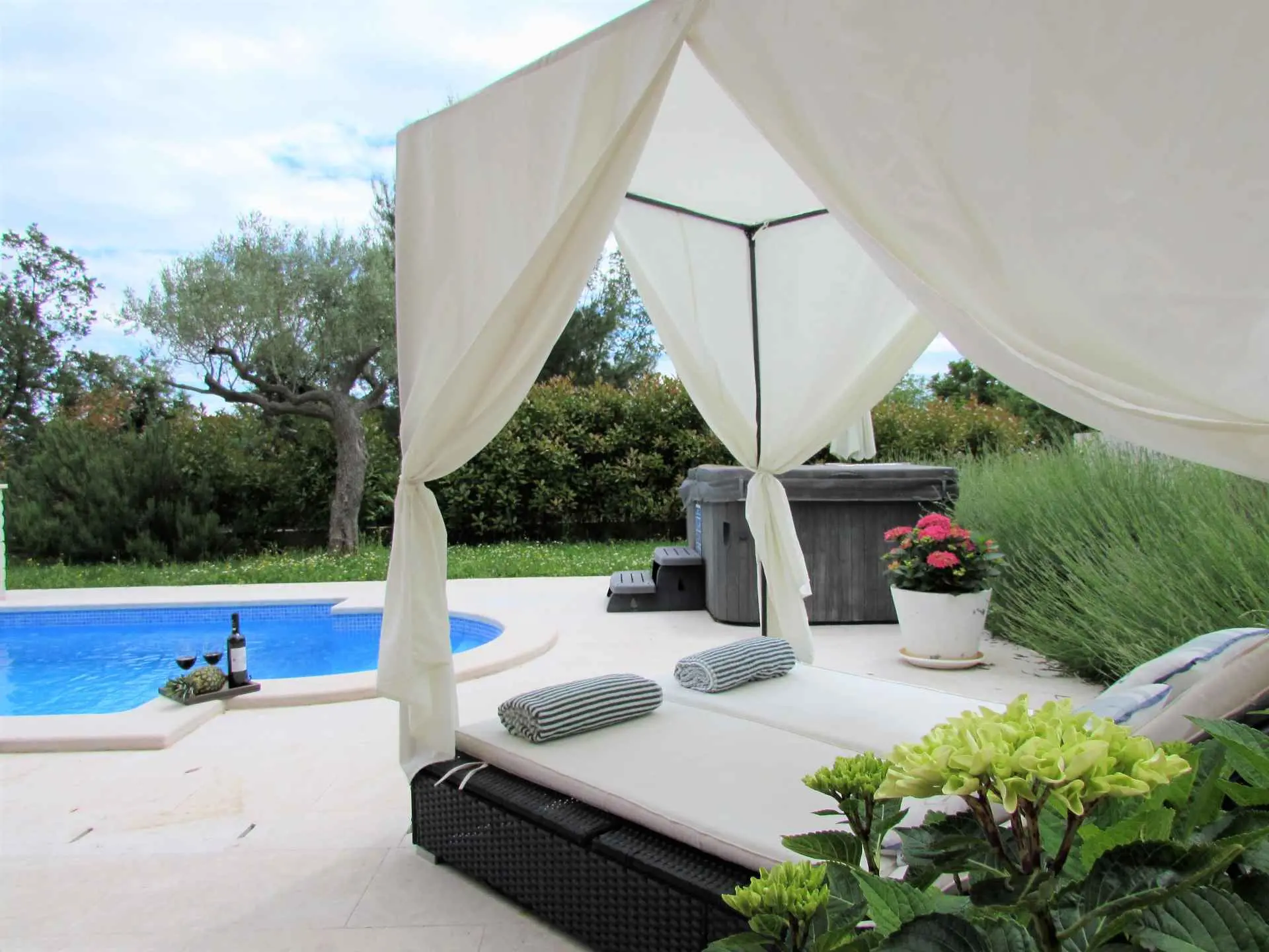 The charming 320m² villa is located in Rakalj, a quiet village on the east coast of Istria, with a beautiful view of Kvarner and the island of Cres, as well as the Ucka Mountains. Air-conditioned bedrooms, WiFi flat, pool, fitness and much more. The charming 320m² villa is located in Rakalj, a quiet village on the east coast of Istria, with a beautiful view of Kvarner and the island of Cres, as well as the Ucka Mountains. The villa is equipped with four air-conditioned bedrooms each with a bathroom, safe, alarm system, three terraces, pool without heating, heated jacuzzi, gym, sauna with shower, living room with dining area, kitchen, playground and billiard table - for up to 10 guests. Bed linen and towels are included